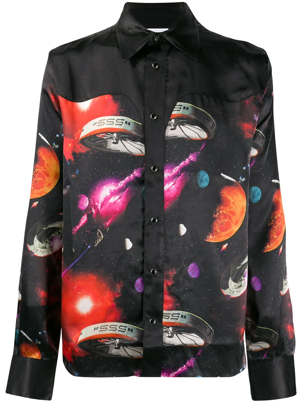 SSS WORD CORP의 저니 플래닛 프린트 셔츠. 클래식 칼라, 앞면의 버튼 플래킷, 긴소매, 곡선 헴.