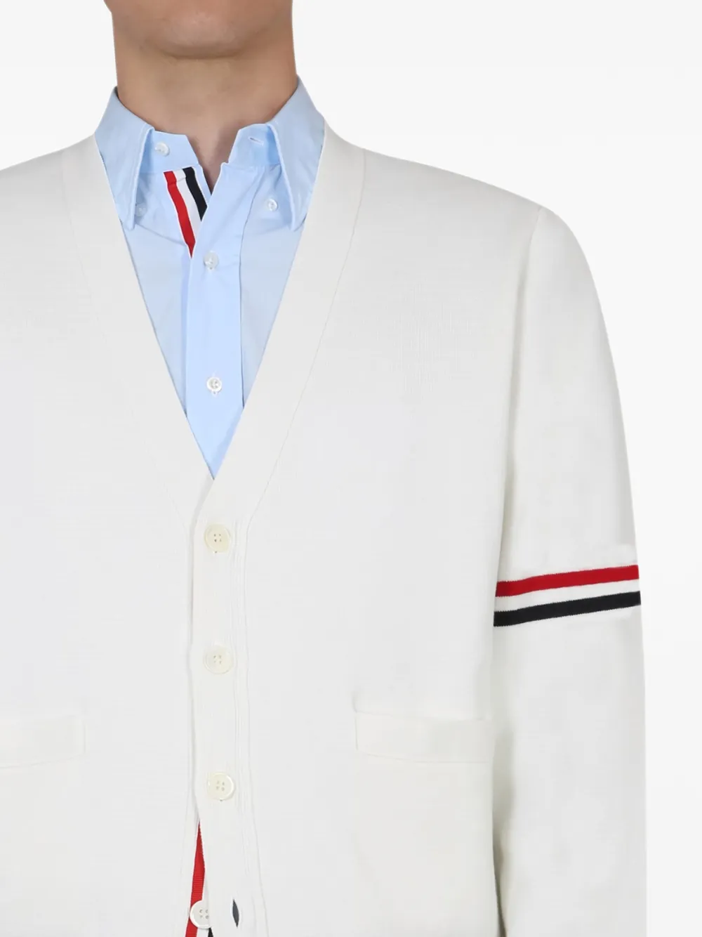 색상: 화이트. 앞면의 버튼으로 잠그는 형식, V넥, 앞면에 있는 두 개의 패치 포켓, 시그니처 4-바 스트라이프, 시그니처 4-바 탭, 긴소매, 버튼 커프스, 옆면의 버튼으로 잠그는 형식, 골지 조직 디테일.