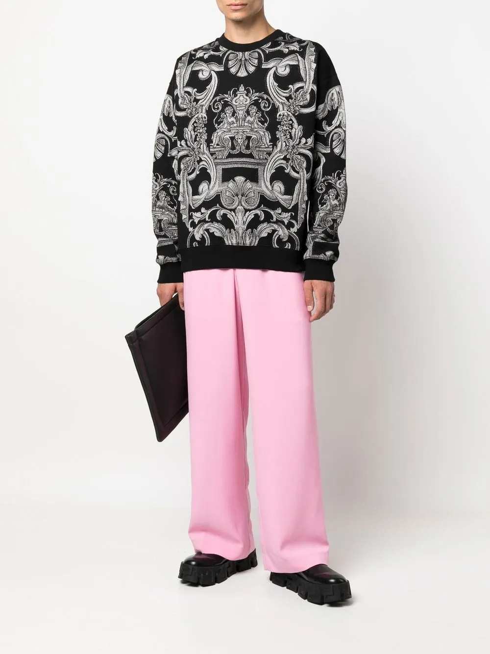 블랙, 코튼 혼방, 시그니처 바로코 프린트, 크루 넥, 골지 밑단, 골지 커프스, 긴소매.