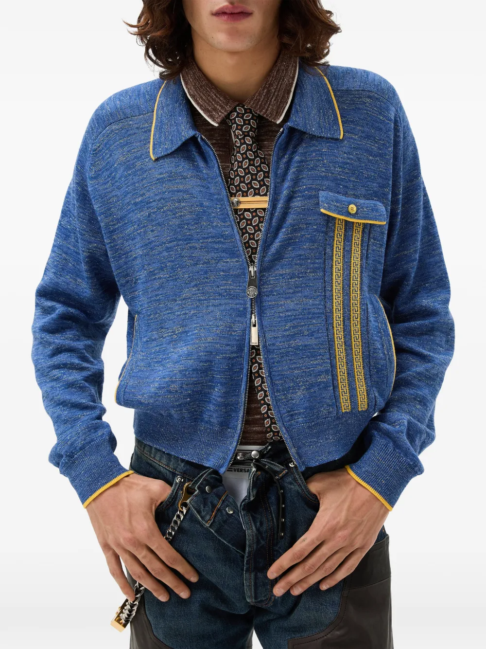 코튼, 린넨, 실크 블렌드 뮬리네 니트 폴로 셔츠로, 대비되는 트리밍과 체스트 포켓의 자카드 그레카 모티프가 특징입니다.