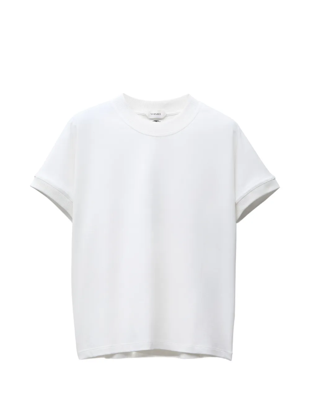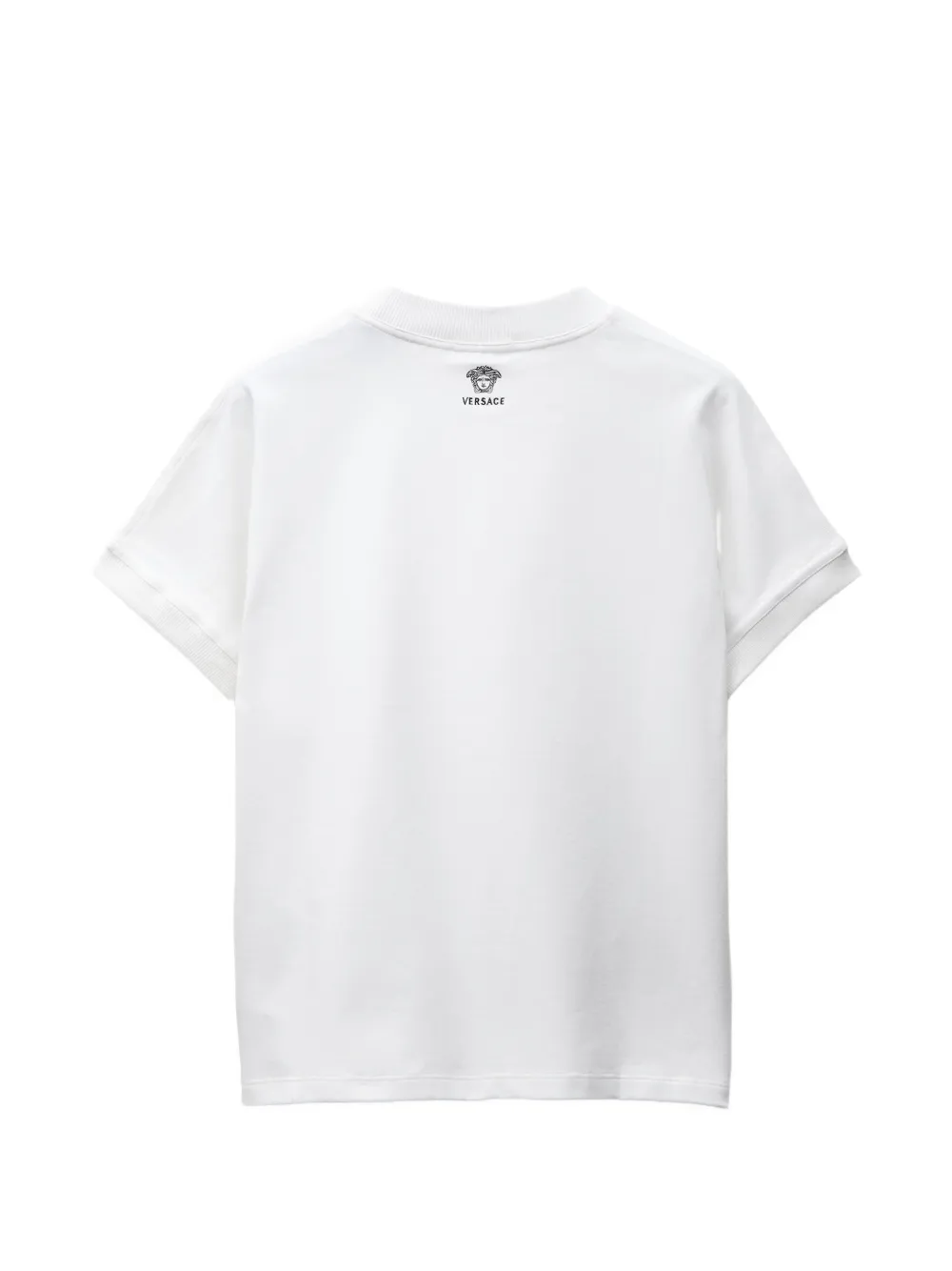 리브드 트리밍과 뒷면의 소형 메두사 및 베르사체 로고 자수가 특징인 슬림 핏 스트레치 코튼 저지 티셔츠입니다.