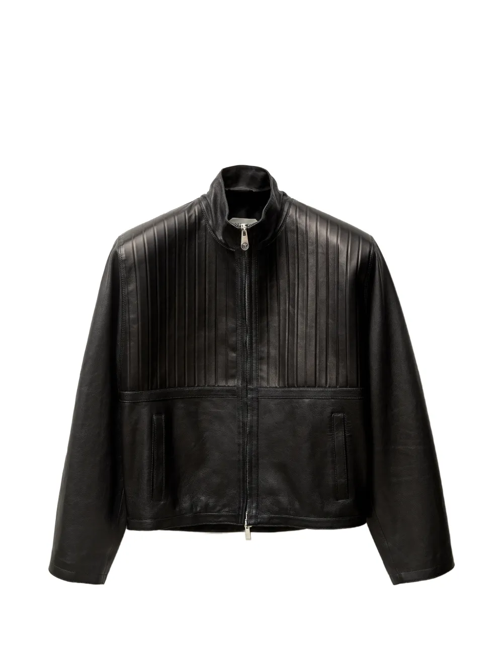 엠보싱 패널과 뒷면 칼라의 베르사체 로고 엠보싱이 돋보이는 지퍼형 플롱제 가죽 블루종 재킷입니다.
