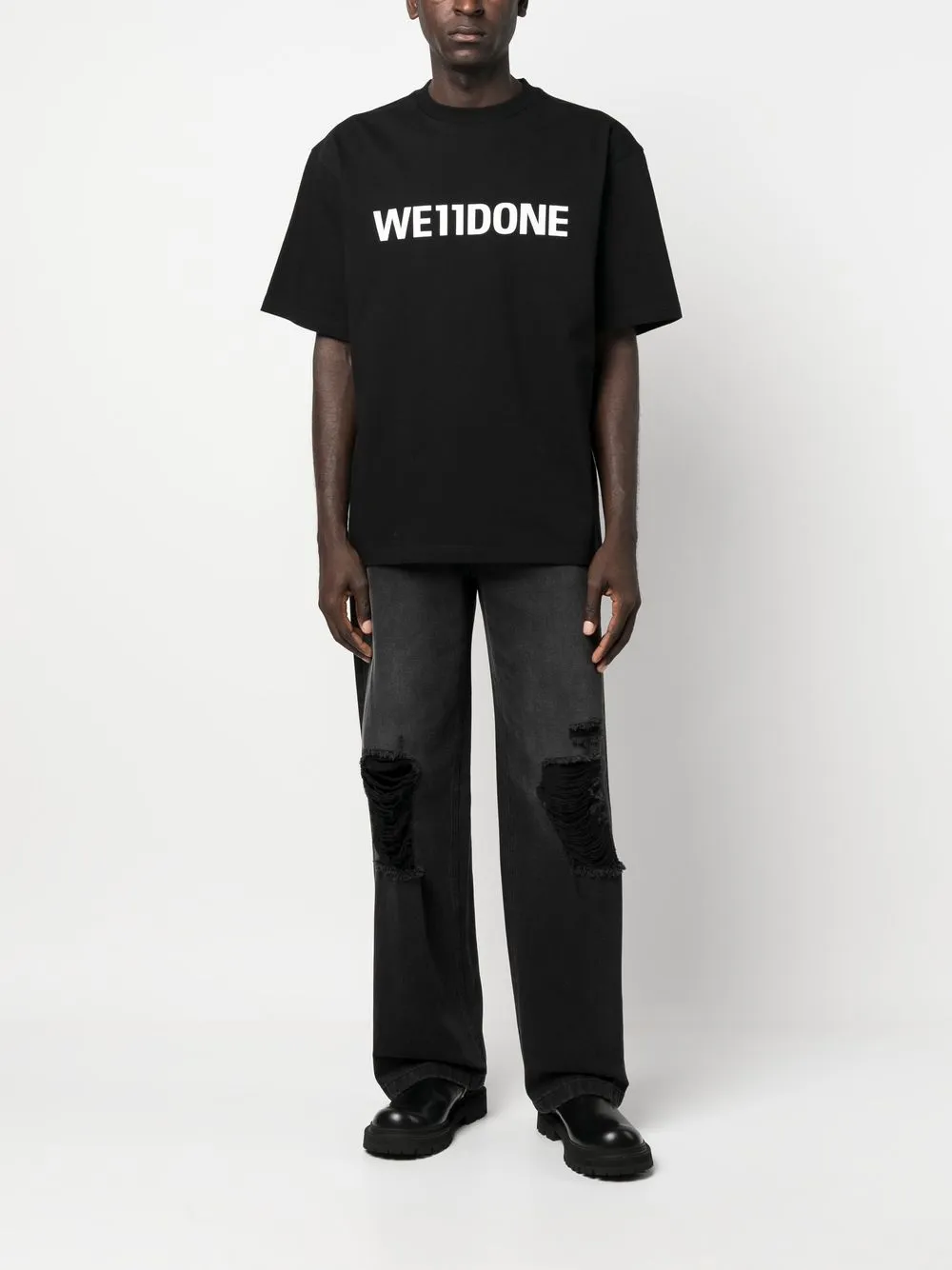 제트 블랙, 코튼, 신축성이 좋은 저지 니트, 앞면의 로고 프린트, 뒷면의 로고 패치, 라운드 넥, 반소매, 직선형의 밑단.
