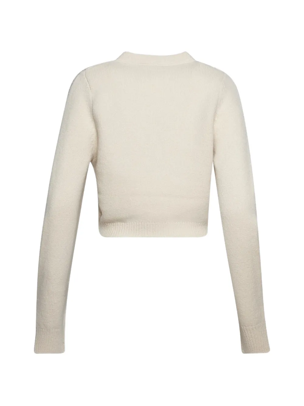 에크루 색상 질감이 느껴지는 소재 V넥 앞면의 버튼으로 잠그는 형식 긴소매 크롭 형태