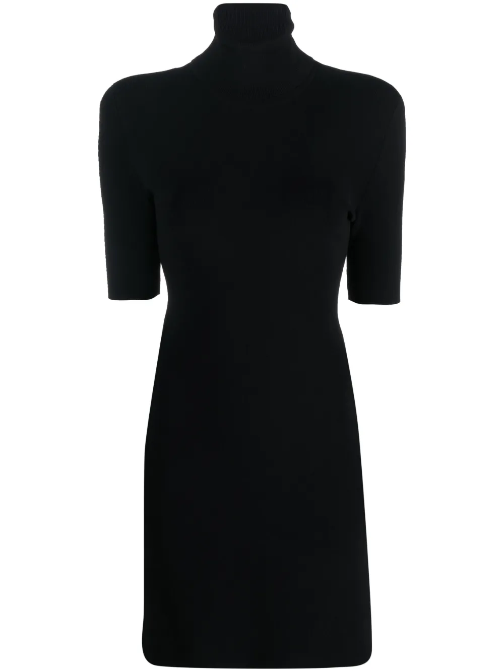 블랙, 신축성이 좋은 저지 니트, 실버 톤 메탈 로고 장식, 롤 넥, 숄더 패드, 반소매, 옆면의 트임, 직선형의 밑단, 무릎 길이.