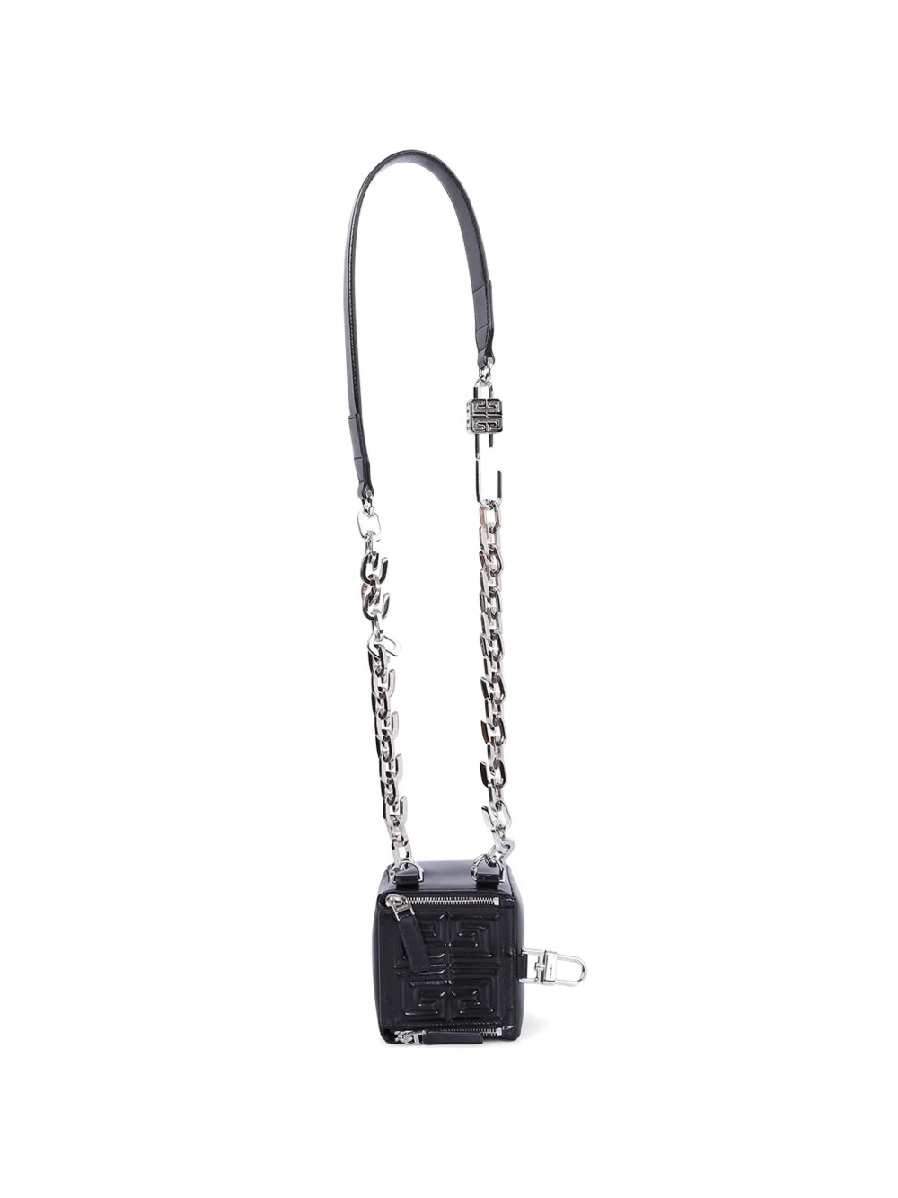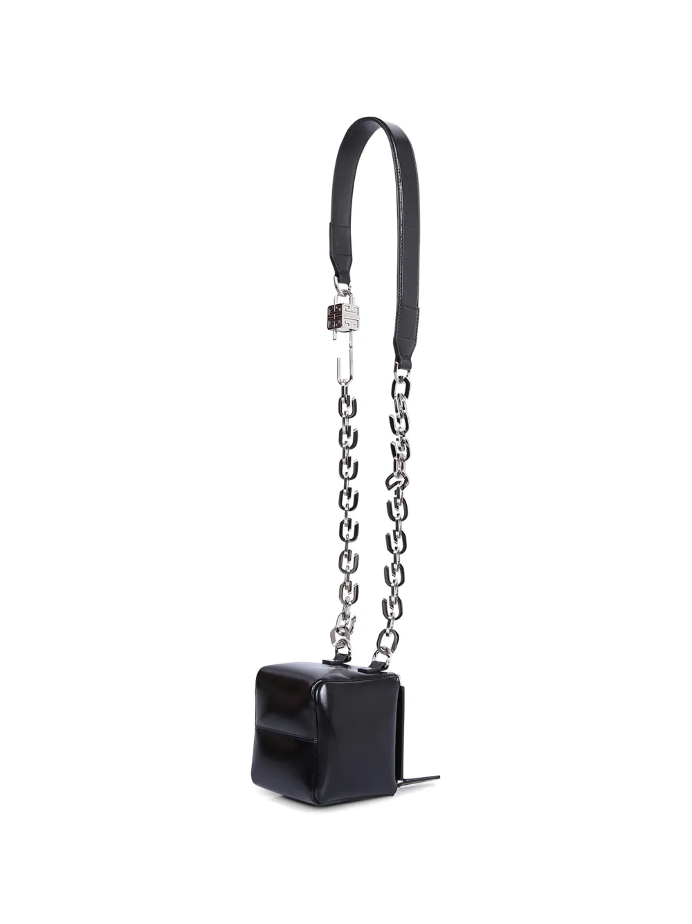 블랙, 송아지 가죽, 실버 톤 하드웨어, 체인과 가죽으로 된 숄더 스트랩.
