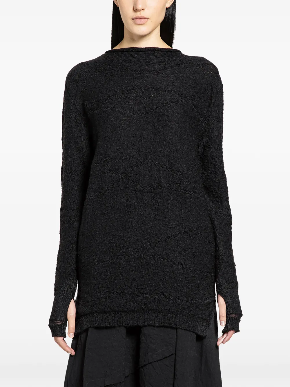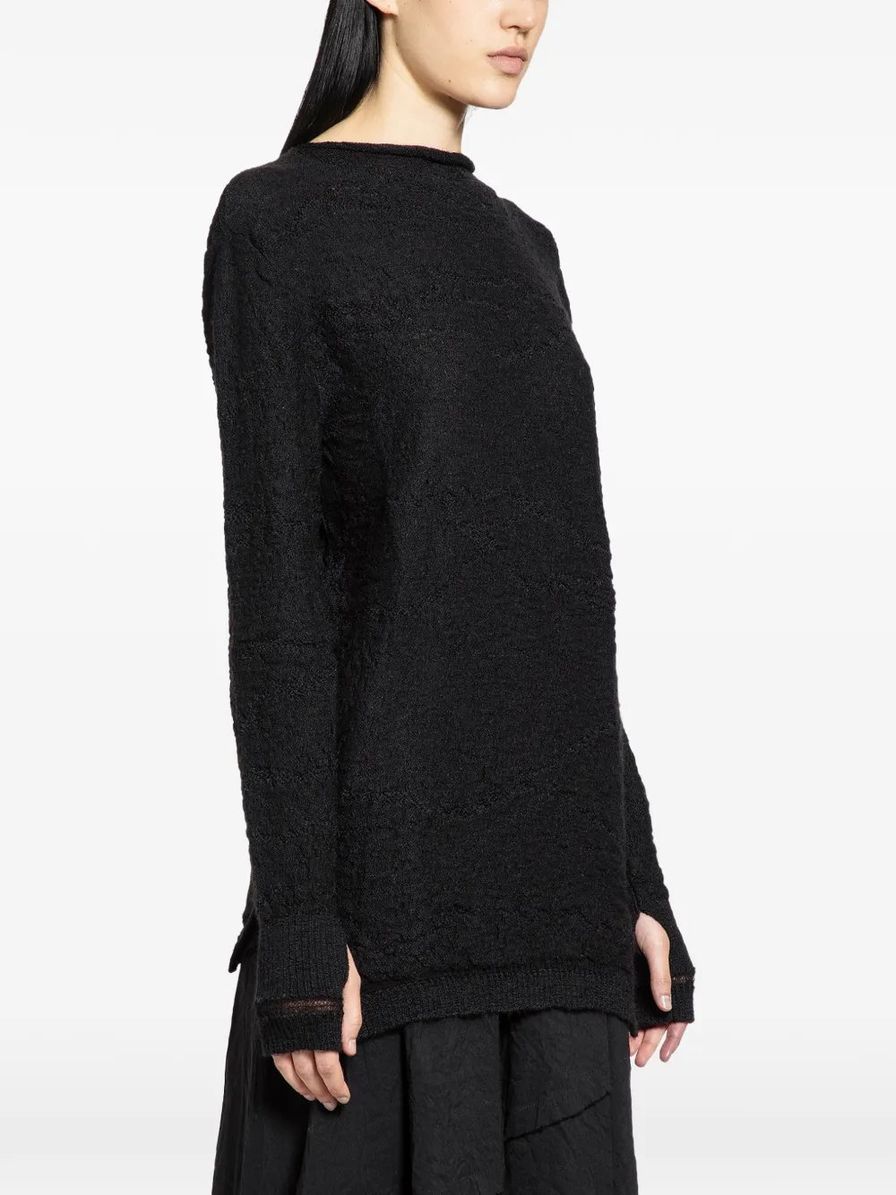블랙 색상 텍스처 니트 긴소매 커프스의 썸홀 라운드 넥 알파카 및 울