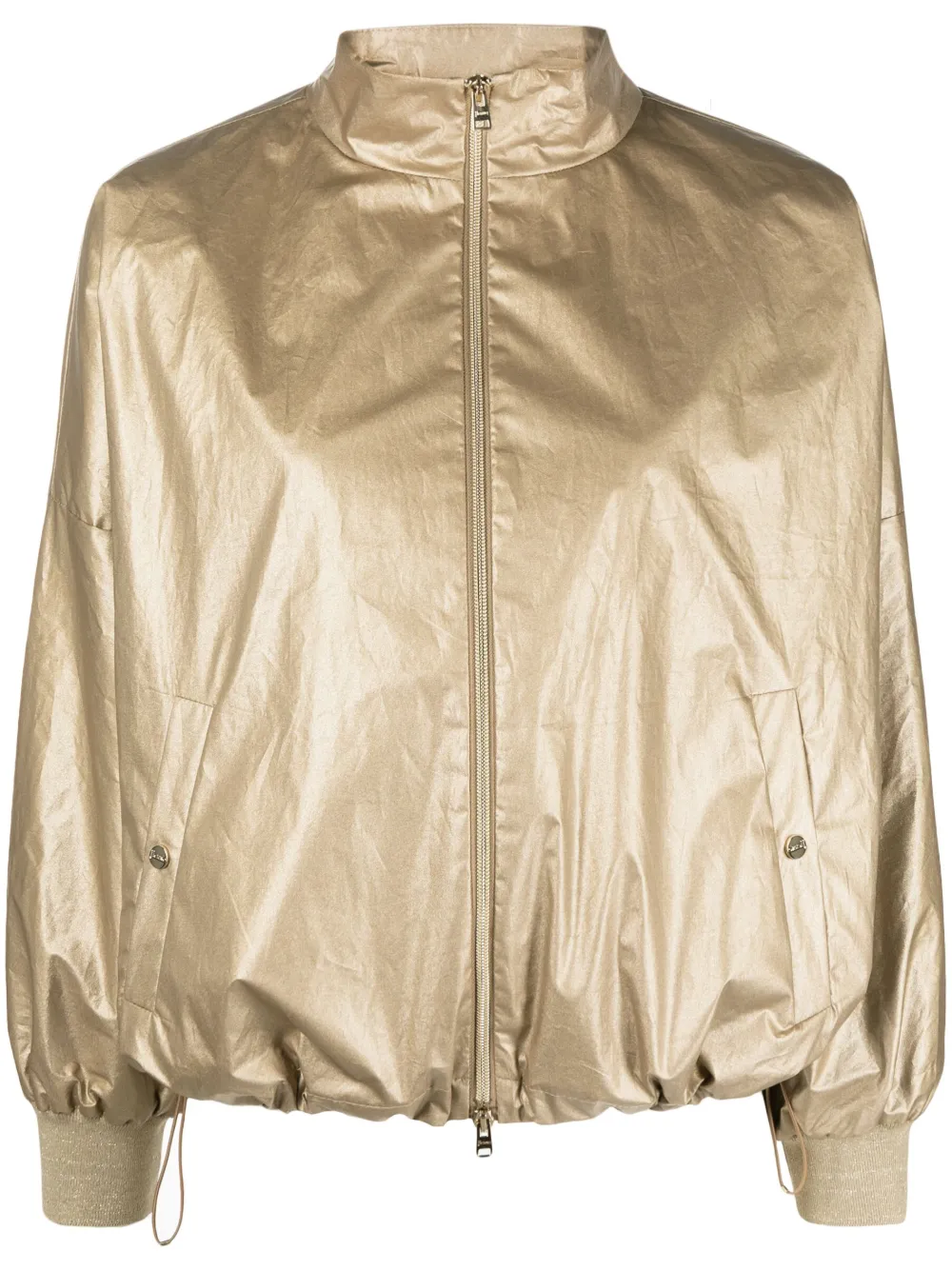 골드 톤, 메탈릭 마감, 앞면의 지퍼로 잠그는 형식, 하이 넥, 옆면에 있는 두 개의 버튼 포켓, 긴소매, 신축성이 있는 커프스, 드로스트링이 있는 헴.