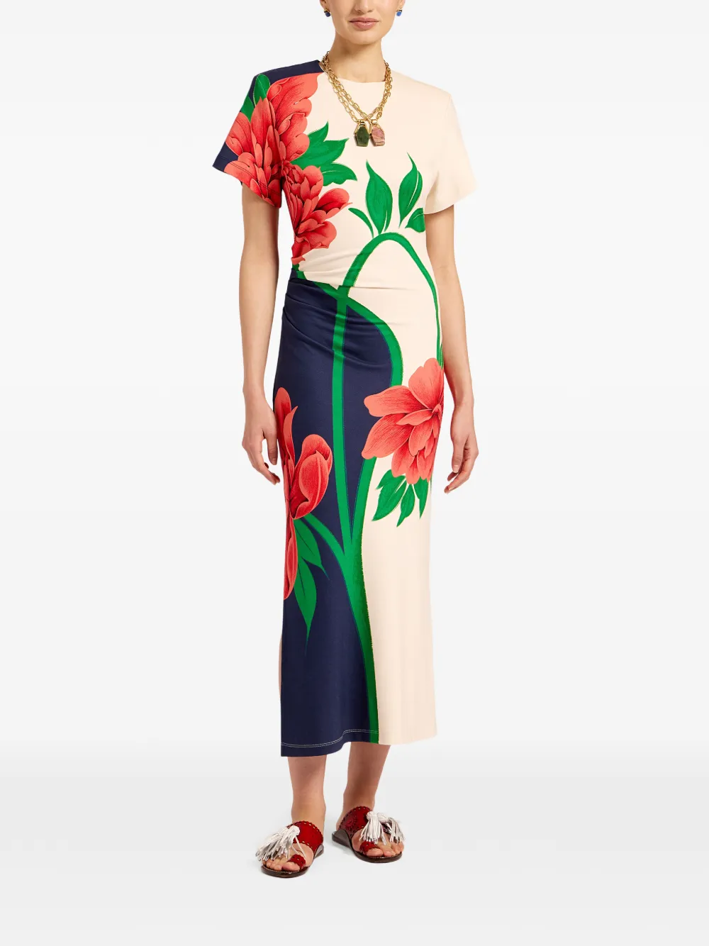 릴라 드레스는 창립자 제이제이 마틴의 쿨한 캘리포니아 감성과 밀라노의 맥시멀리즘이 완벽하게 조화를 이룬 결과물입니다. 마틴의 쿨한 캘리포니아 감성과 밀라노 특유의 맥시멀리즘이 조화를 이룹니다. 미 서부 특유의 여유로운 티셔츠 드레스 실루엣에 파격적인 변주를 준 피스로, 강렬한 숄더 라인과 허리의 셔링 디테일을 더해 매혹적인 아워글래스 실루엣의 세련된 반전을 선사합니다. 몸의 곡선을 따라 부드럽게 흐르는 이탈리안 스트레치 저지 소재로 제작되어 매우 편안하며, 퀸 피오니 프린트가 선사하는 압도적인 우아함이 돋보입니다. 베니스 비치의 산책로에서 친구의 격식 있는 결혼식 파티까지, 장소를 불문하고 어디서든 완벽하게 어우러지는 놀라운 활용도를 자랑합니다.