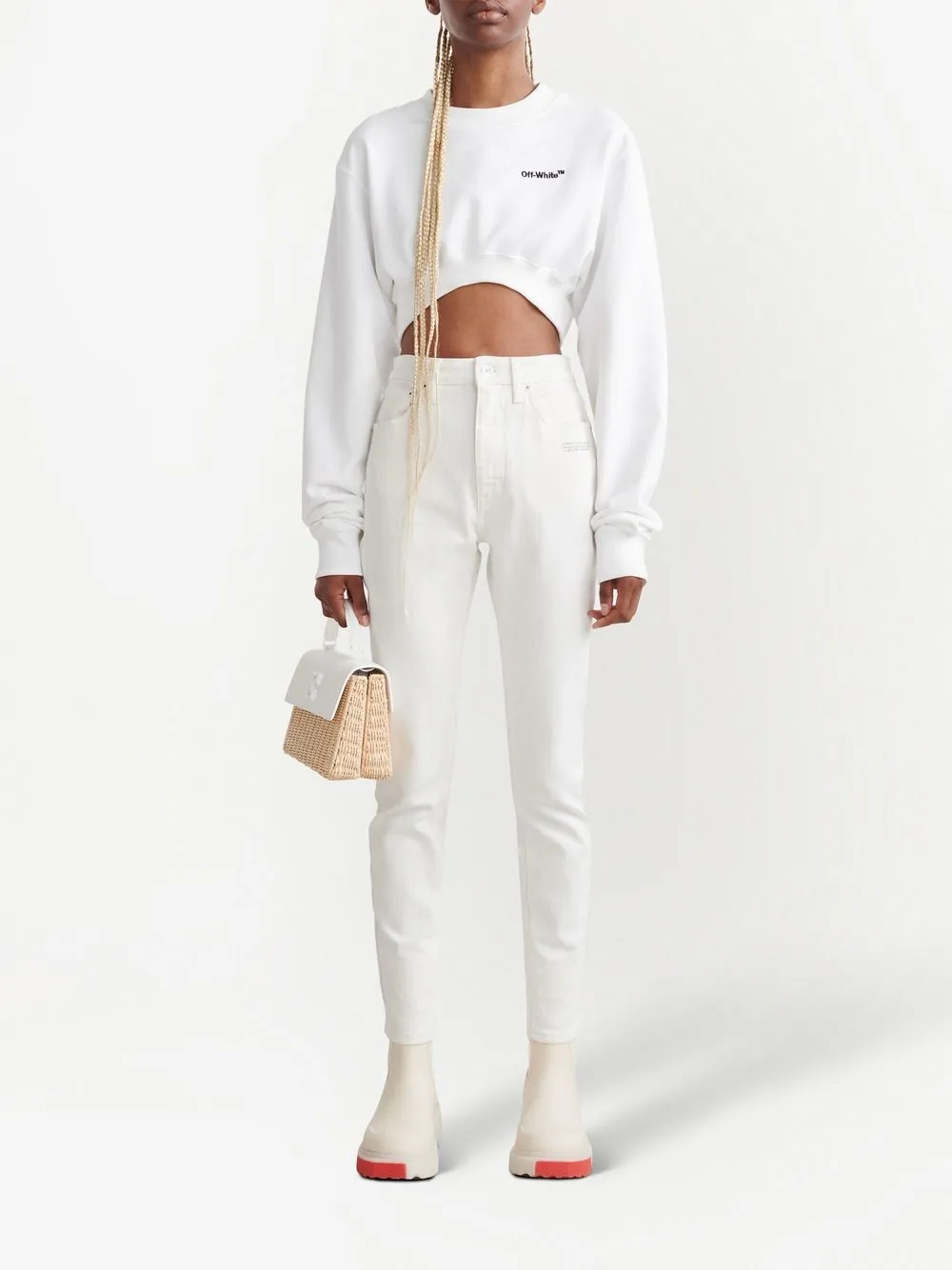 화이트, 스트레치 코튼, 하이웨이스트, 앞면의 버튼으로 잠그는 형식, 앞면의 지퍼로 잠그는 형식, 옆면의 슬립 포켓, 일자로 떨어지는 핏.