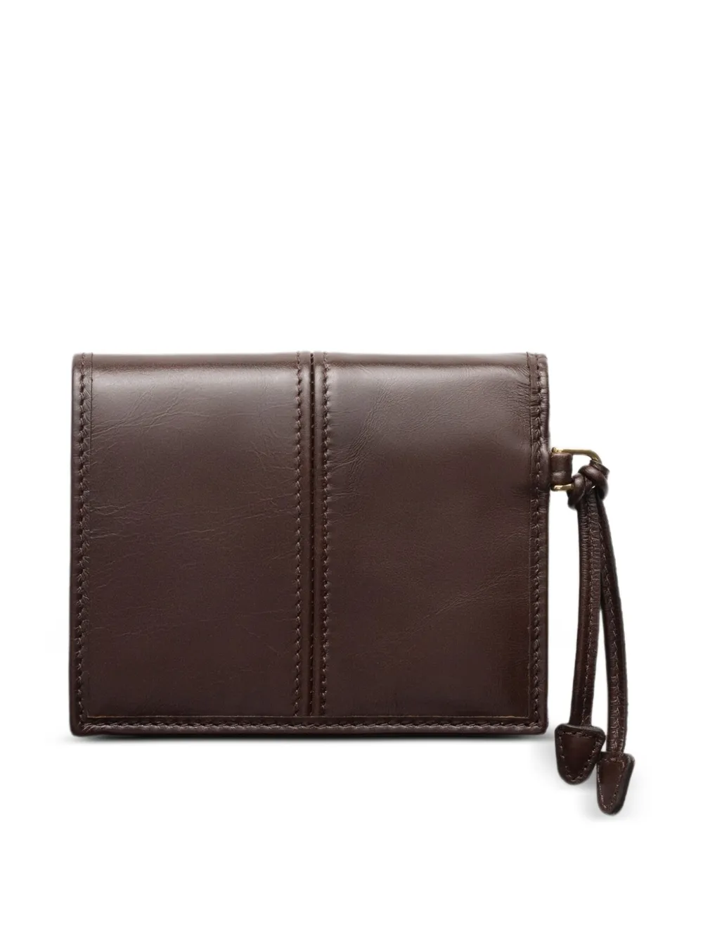 Snap closure Enameled metal triangle logo One bill compartment Three card slots Two internal pockets Internal zipper coin pocket Moiré and leather lining Leather This modern and sophisticated leather wallet is characterized by refined details that enrich the design provided with several pockets and internal coin pocket.