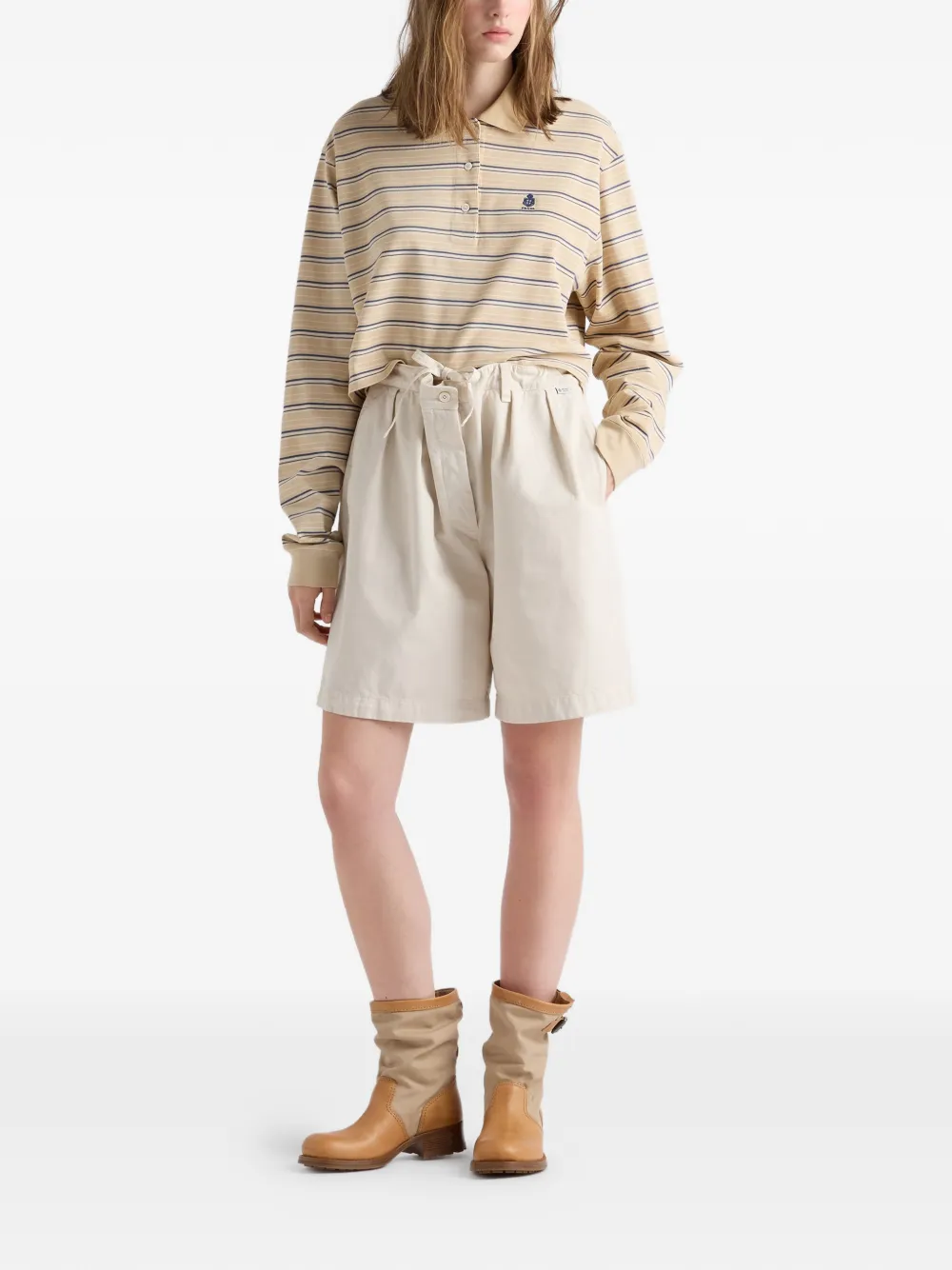 상품 설명 스타일 이 버뮤다 쇼츠는 세련된 디테일을 통해 자연스럽고 캐주얼한 우아함을 구현합니다. 여유롭고 가벼운 실루엣에 드로스트링 웨이스트를 더해 편안하고 릴랙스한 핏을 선사합니다. 장인 정신이 깃든 가공 처리를 거친 코튼 개버딘 소재는 특유의 촉각적인 질감을 획득하여 스타일에 개성을 더해줍니다.