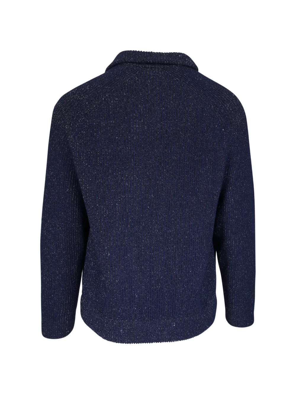 navy blue ribbed knit flecked effect high neck front button and zip fastening long sleeves two side pockets ribbed cuffs and hem