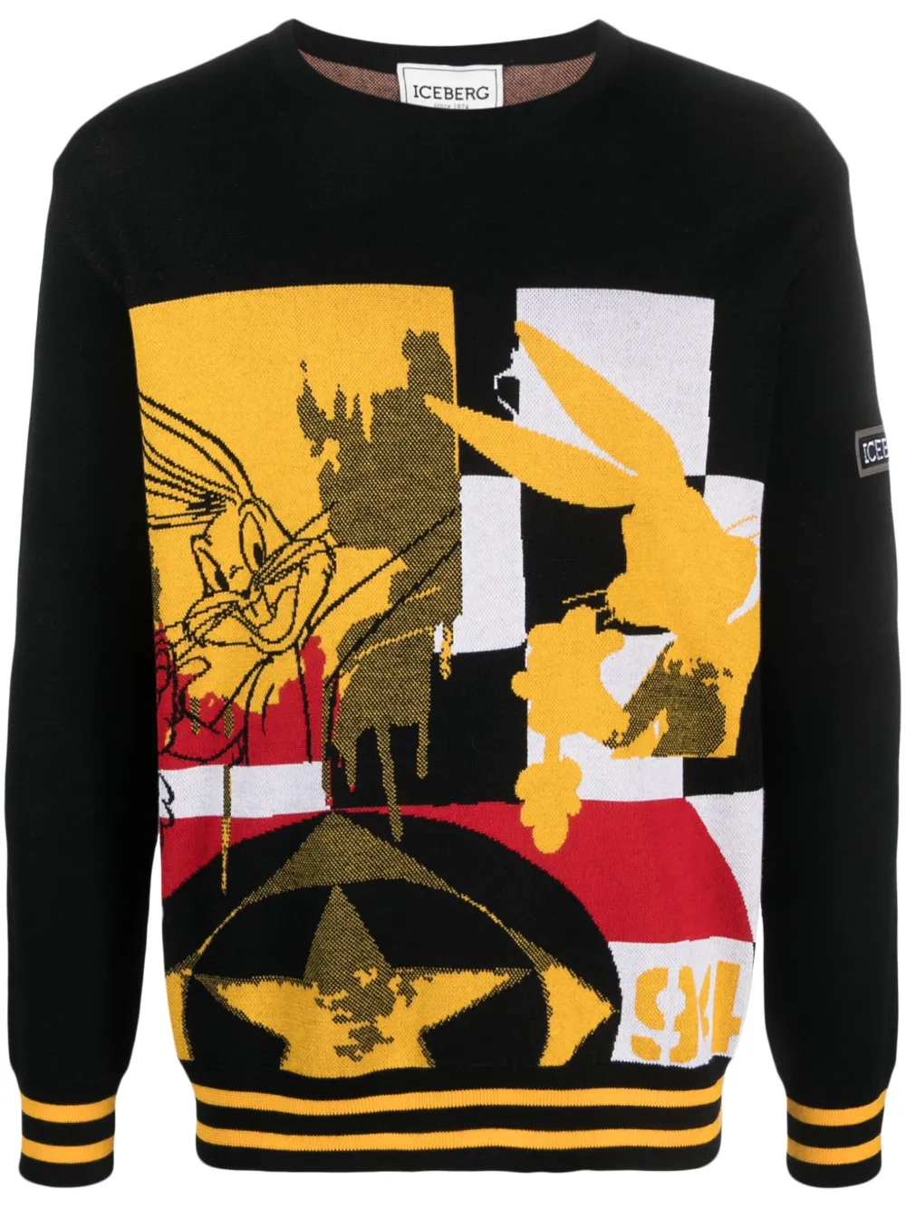 Черный/разноцветный, смесовая необработанная шерсть, трикотажный материал, вязка в технике интарсия, мультипликационный принт, нашивка с логотипом на рукаве, полоски, круглый вырез и длинные рукава.