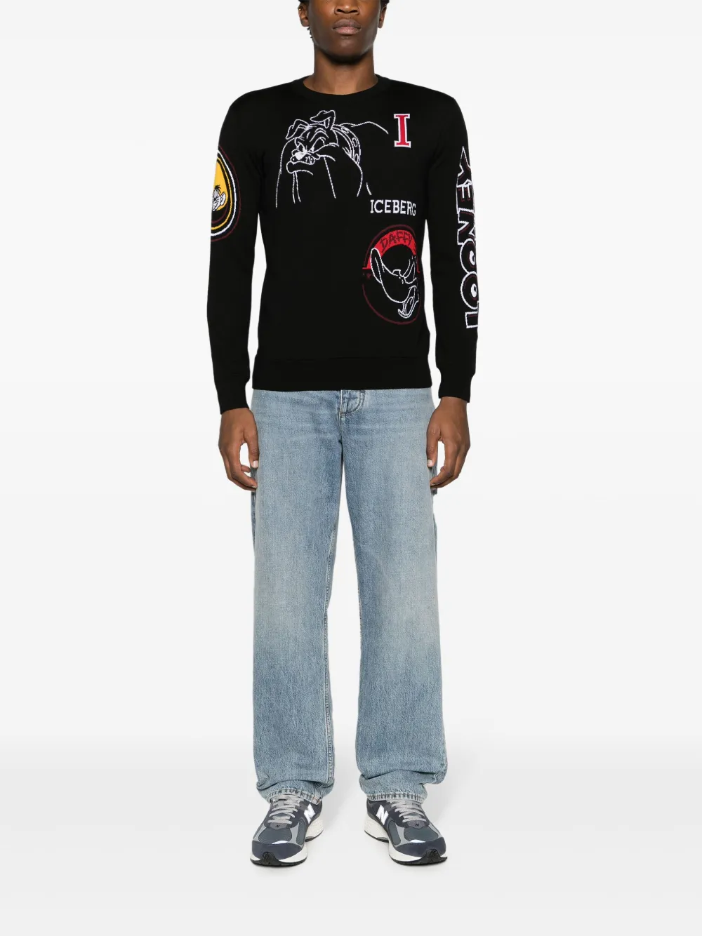 Необработанная шерсть, трикотажный материал, мультипликационный принт, круглый вырез и длинные рукава.