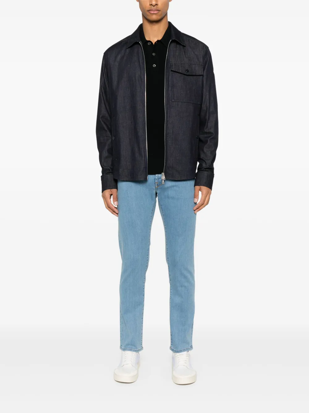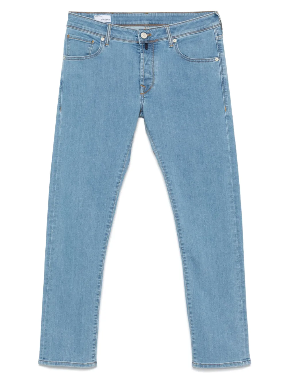 Эффект потертости, декоративные складки, застежка на молнии и пуговице спереди, петли для ремня, классическая пятикарманная модель и узкий крой. Цвет: синий.