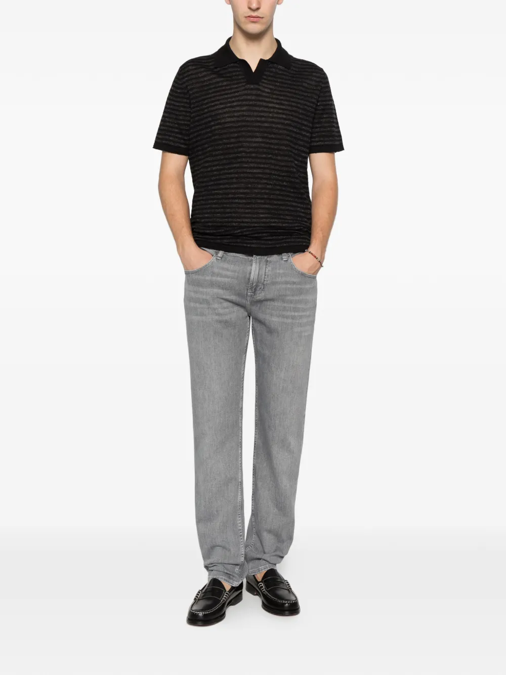 black horizontal stripe pattern polo collar V-neck short sleeves ribbed cuffs straight hem