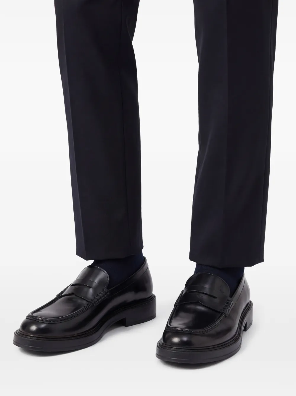 Черный, телячья кожа, тисненый логотип спереди, прорези на язычке, миндалевидный носок и низкий блочный каблук.