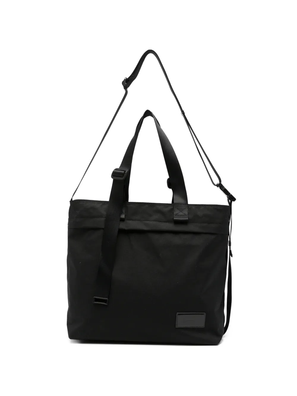 black canvas two adjustable top handles adjustable shoulder strap logo patch to the front top zip fastening internal zip pocket