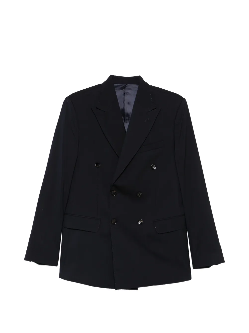 dark blue double breasted button fastening peak lapels long sleeves chest welt pocket front flap pockets logo patch