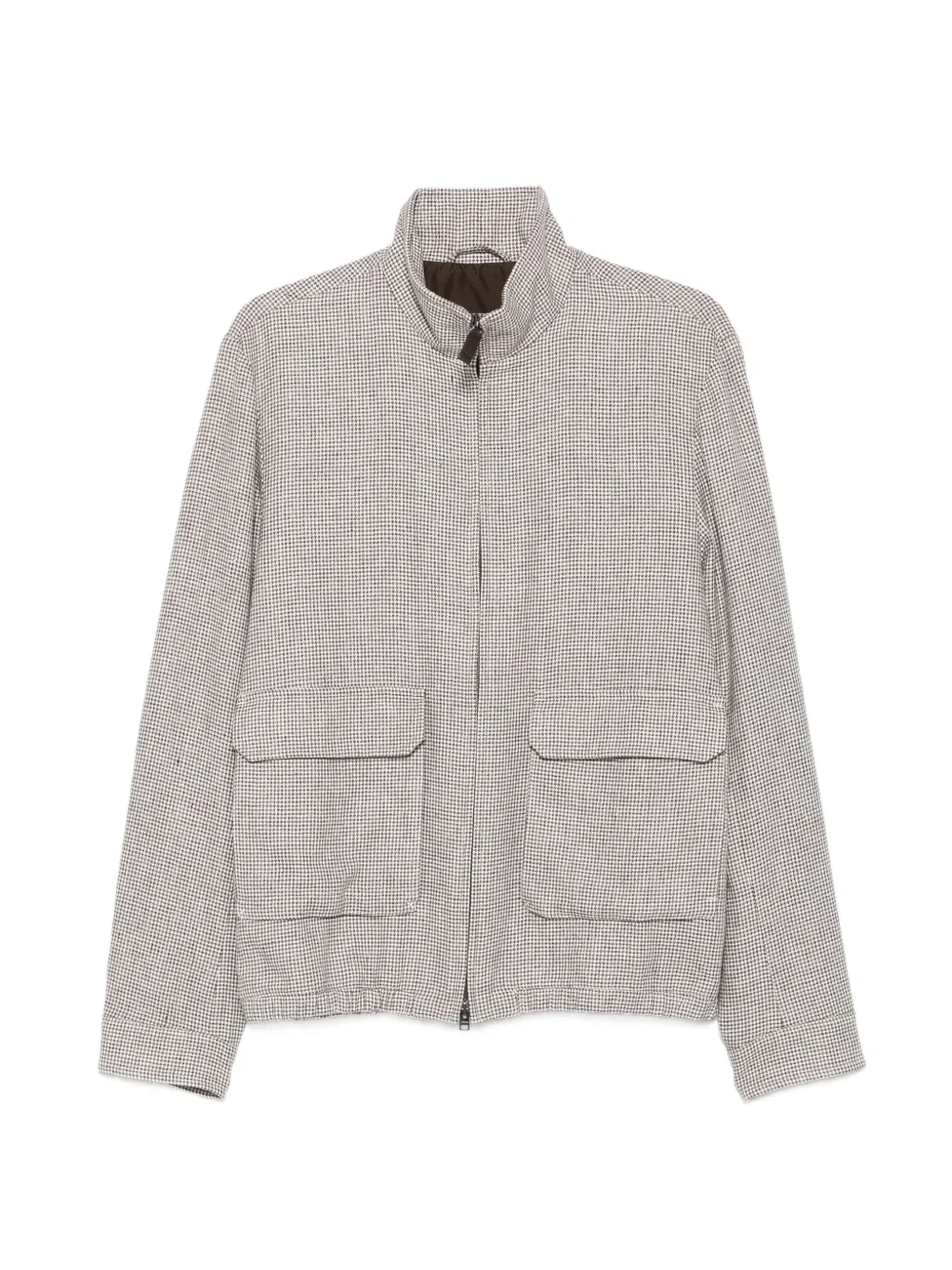 beige and brown houndstooth pattern front zip fastening long sleeves two front flap pockets buttoned cuffs