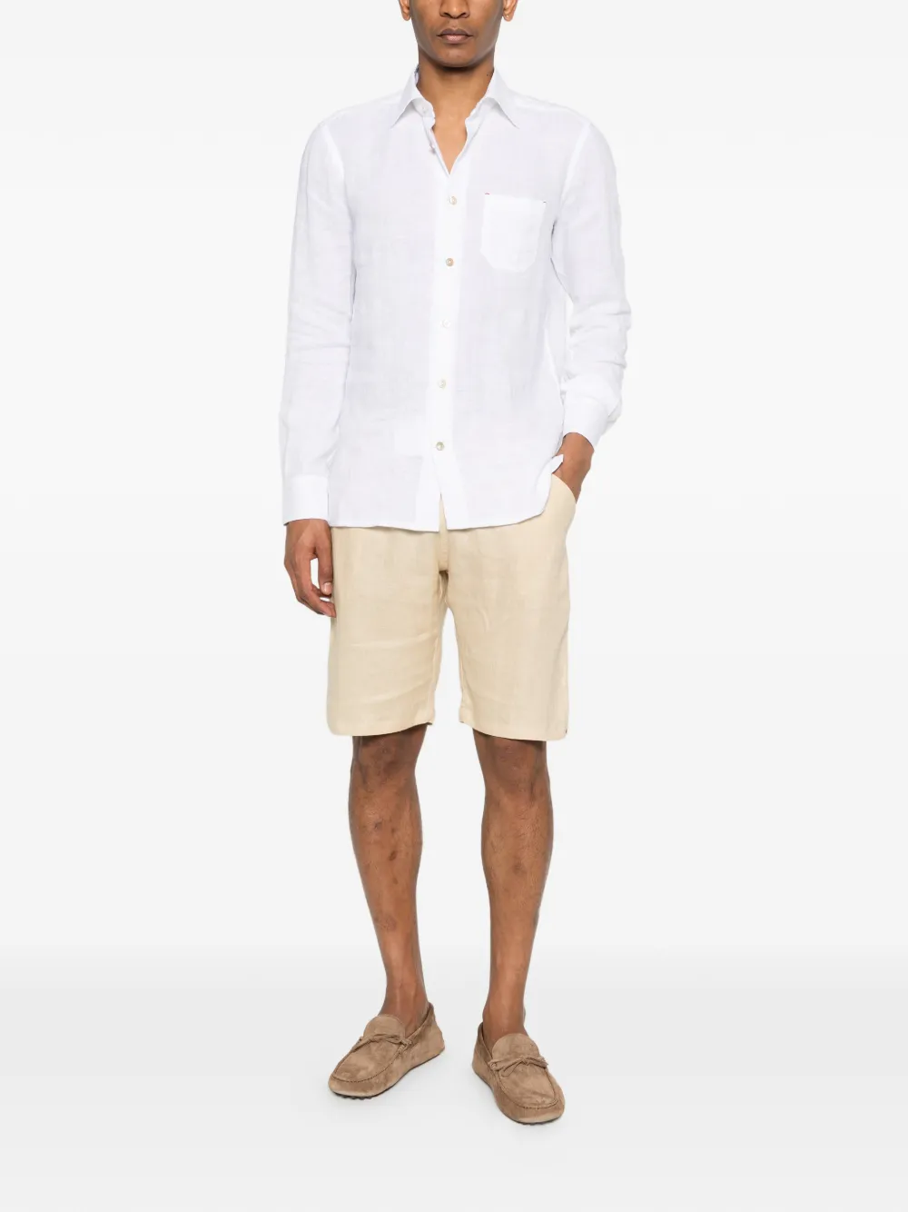 beige drawstring fastening side diagonal pockets back jetted pocket embroidered detail