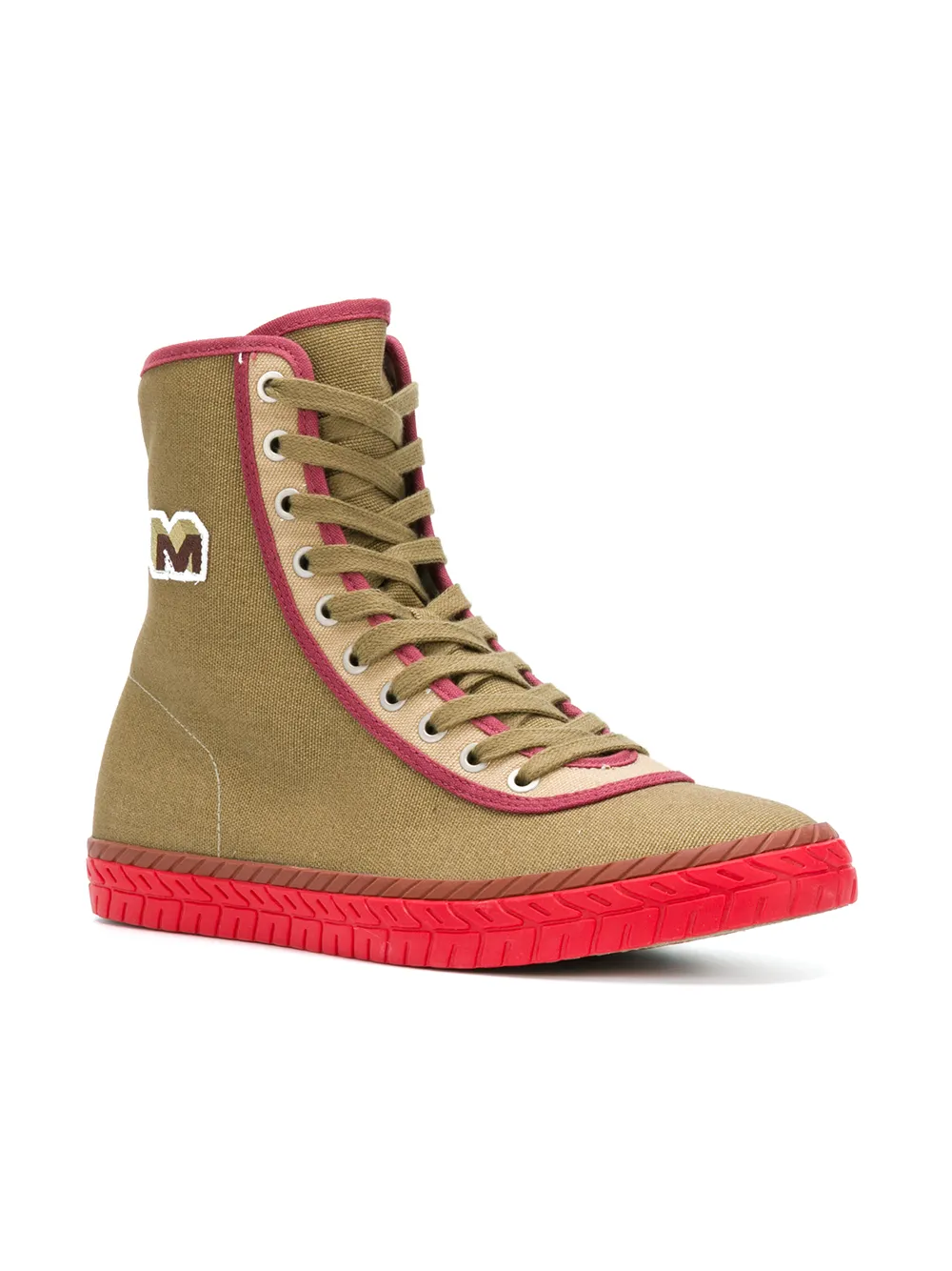 Baskets à patch logo M en coton camel, beige et framboise Marni avec bout rond, fermeture à lacets, hauteur cheville et semelle plate en caoutchouc.