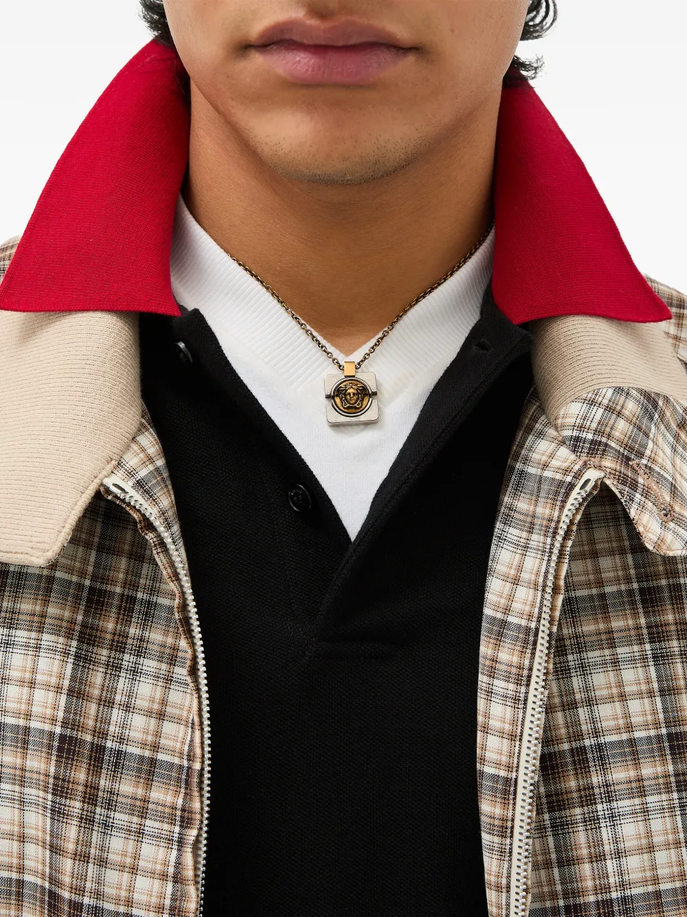 Collier en chaîne fine à fini galvanisé et pendentif à ornements Medusa contrastants. Tous les bijoux Versace sont sans plomb et sans nickel. Tous les matériaux sont hypoallergéniques.