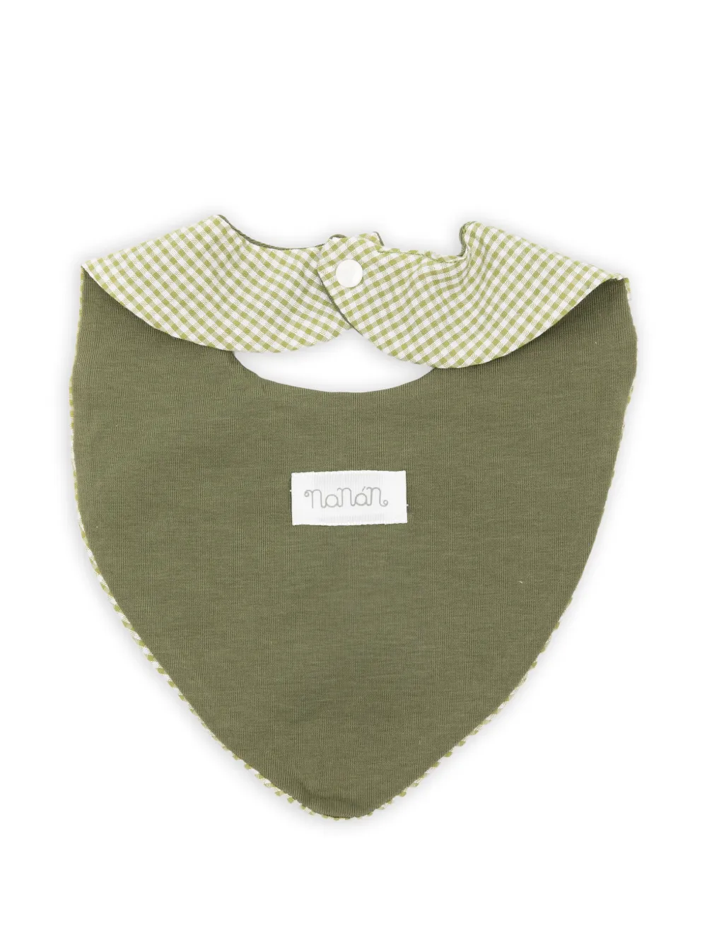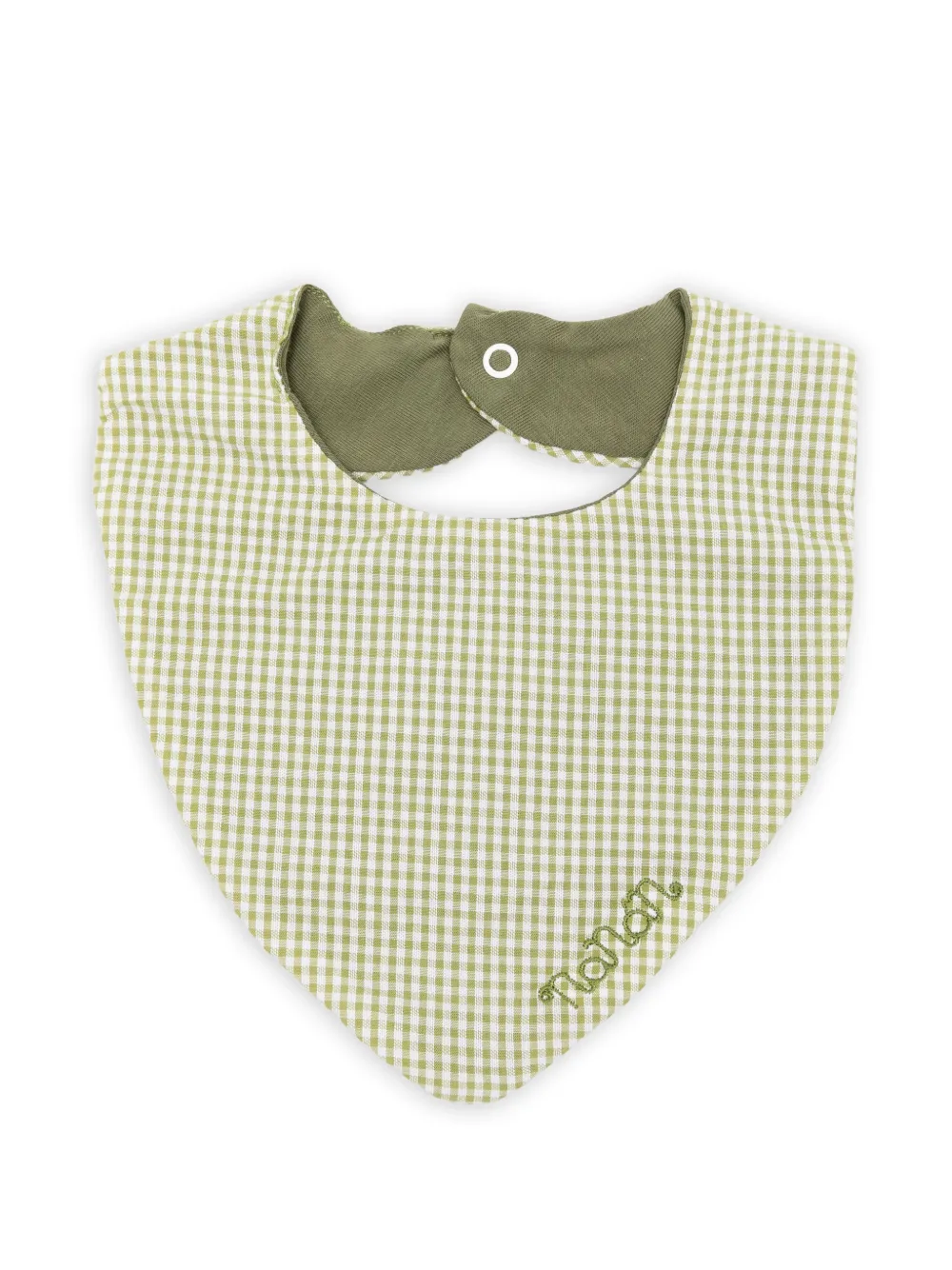 green and white gingham pattern logo embroidery snap-button closure rounded collar