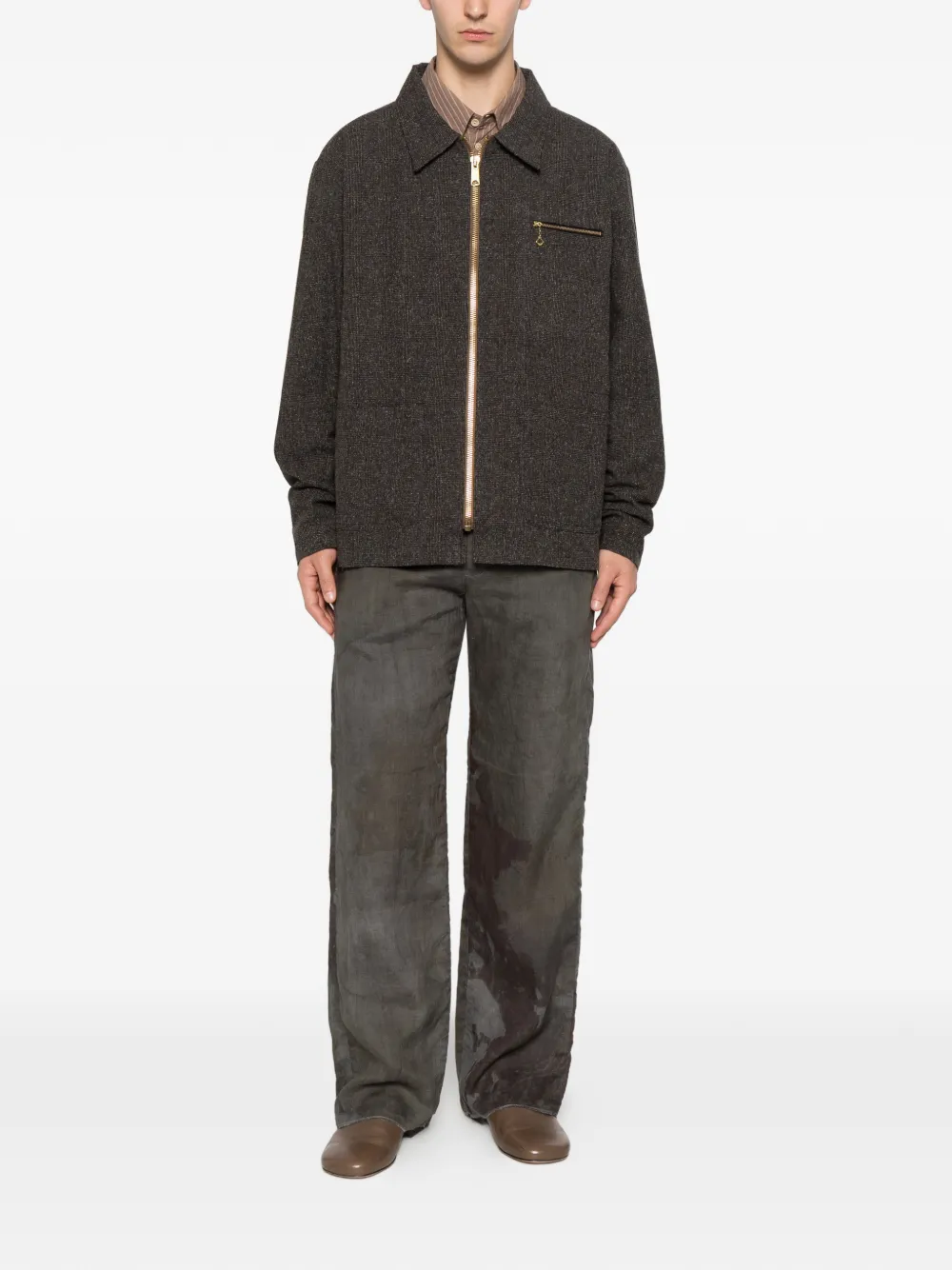 dark brown check pattern spread collar front zip fastening long sleeves zip-fastening chest pocket gold-tone hardware straight hem