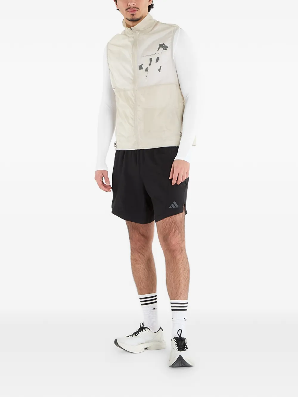 beige estampado gráfico en la parte delantera cuello alto cierre de cremallera en la parte delantera sin mangas dos bolsillos laterales con cremallera bolsillo de parche en la parte posterior dobladillo con cordones