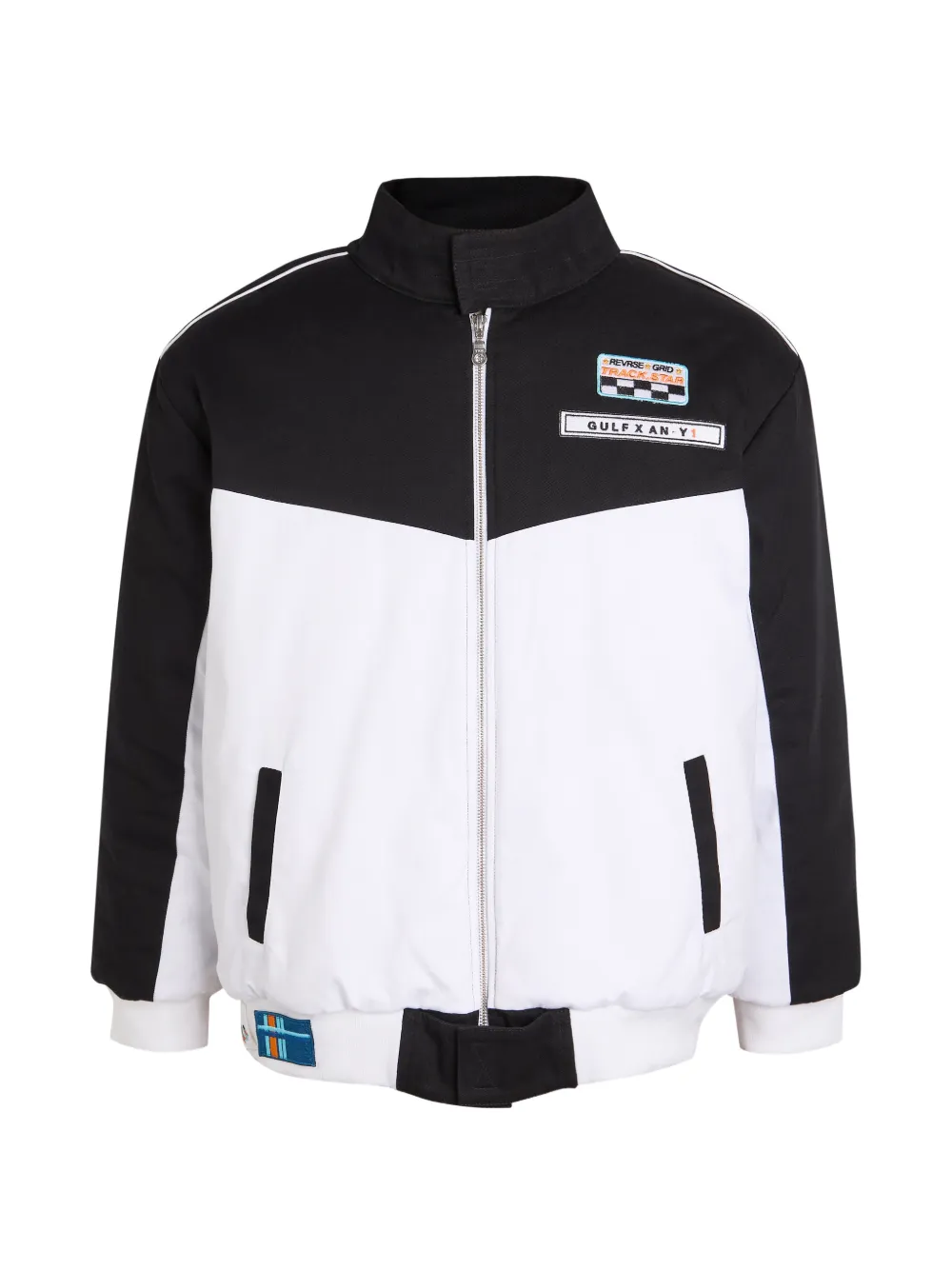 black and white colour block design front zip fastening point collar long sleeves patch to the front
