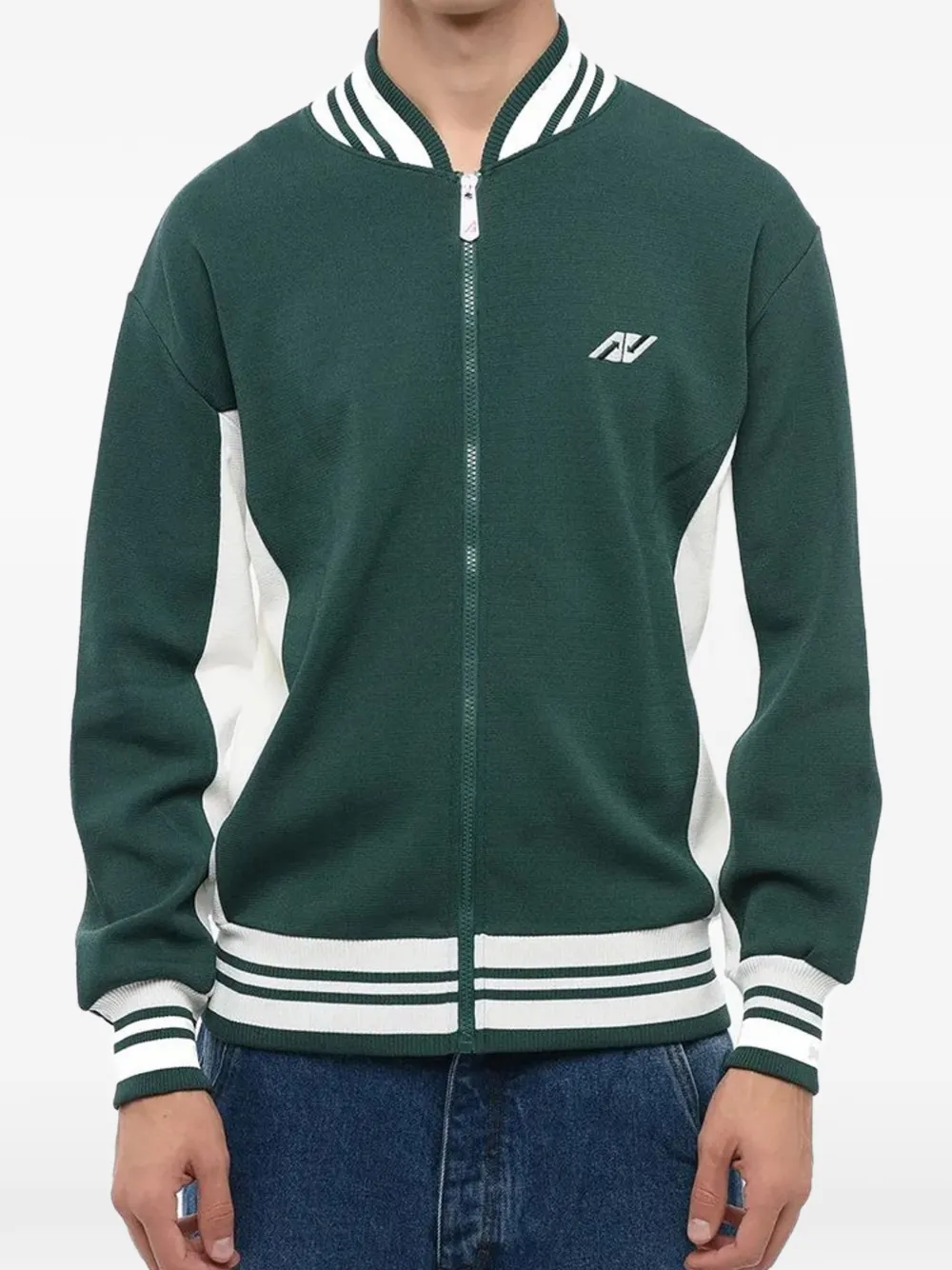 green panelled design logo patch at the chest front zip fastening stripe-trim baseball collar long sleeves stripe-trim cuffs and hem