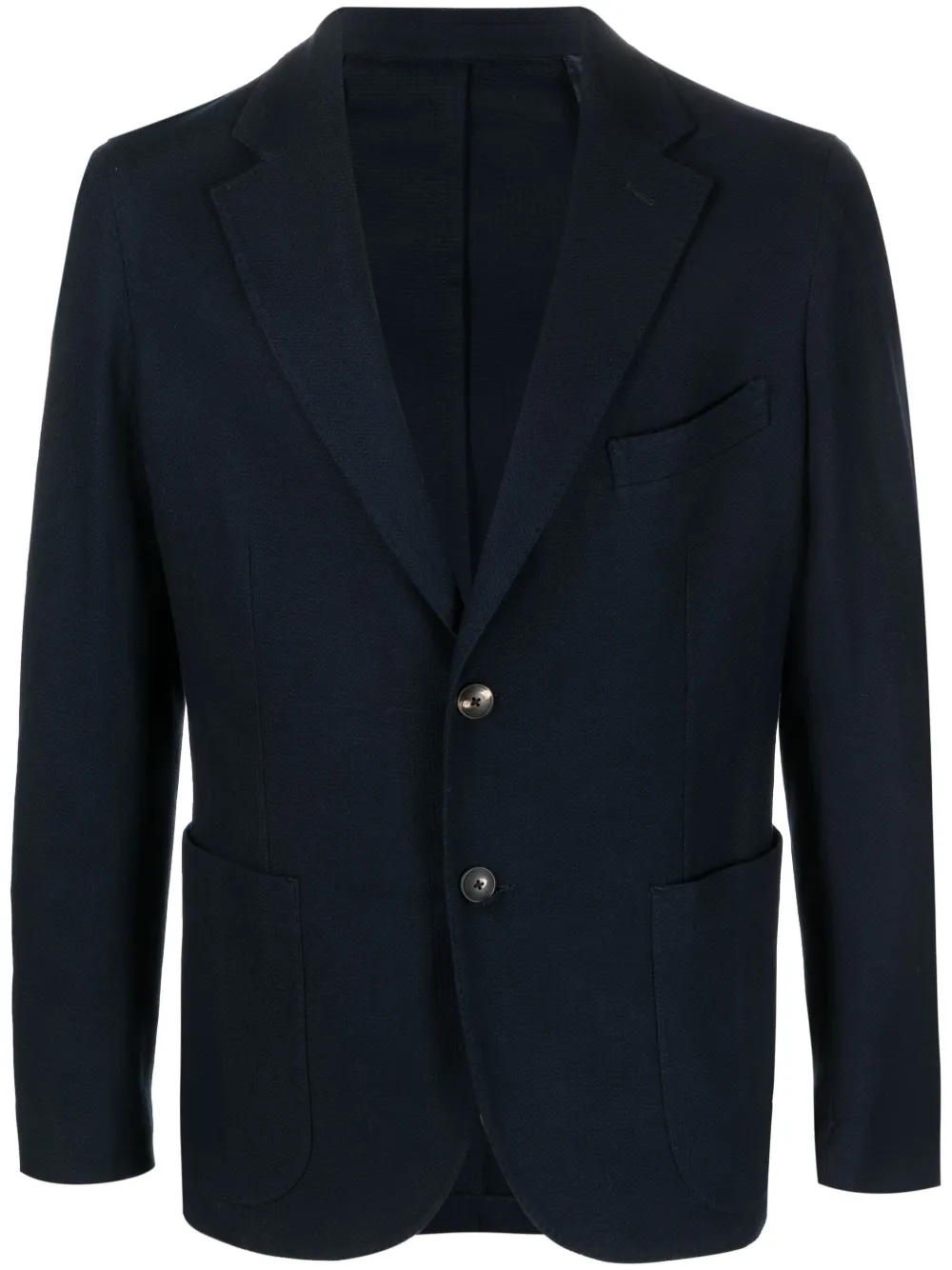Azul marino, algodón, solapas de muesca, cierre con botones en la parte delantera, bolsillo con ribete en el pecho, dos bolsillos de parche en la parte delantera, manga larga, puños con botón y abertura con diseño inglés en la parte posterior.