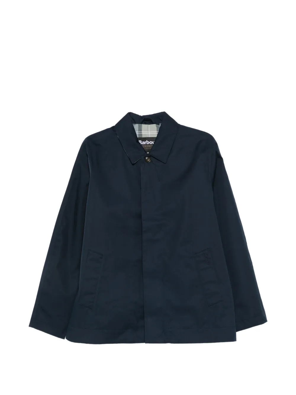 navy blue concealed front fastening classic collar long sleeves two side pockets straight hem