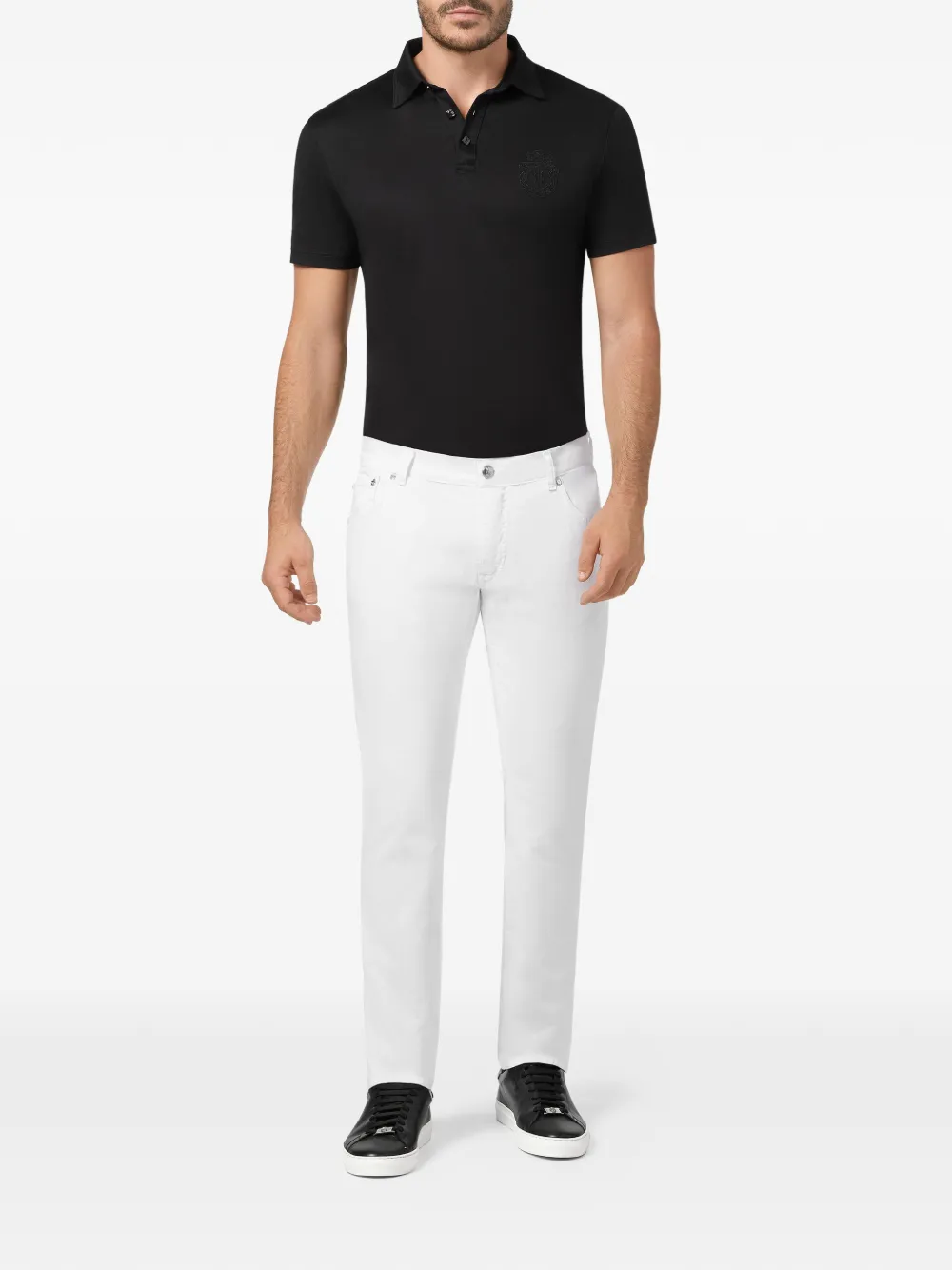 blanco diseño de cinco bolsillos cierre con botón y cremallera en la parte delantera detalle del logo en la parte posterior diseño recto