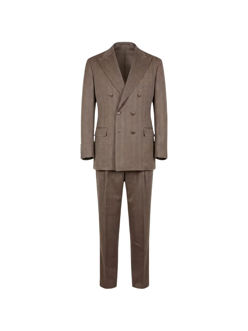 brown herringbone pattern peak lapels double-breasted button fastening long sleeves buttoned cuffs chest patch pocket side flap pockets pressed crease