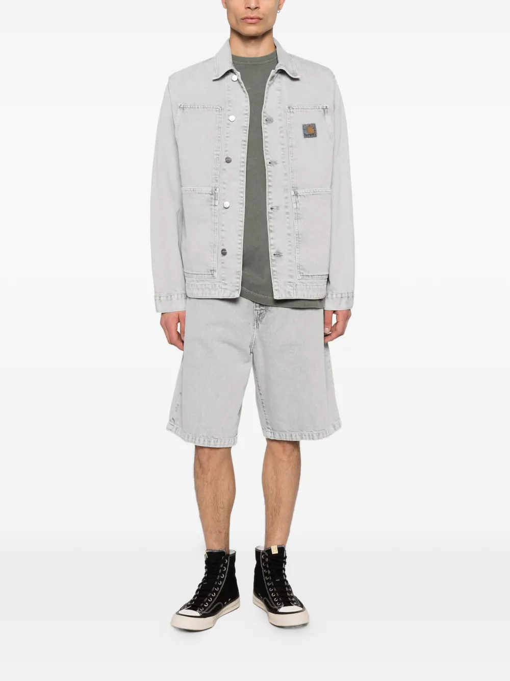 black/grey chalk wash double front pockets square label button fastening rivet details