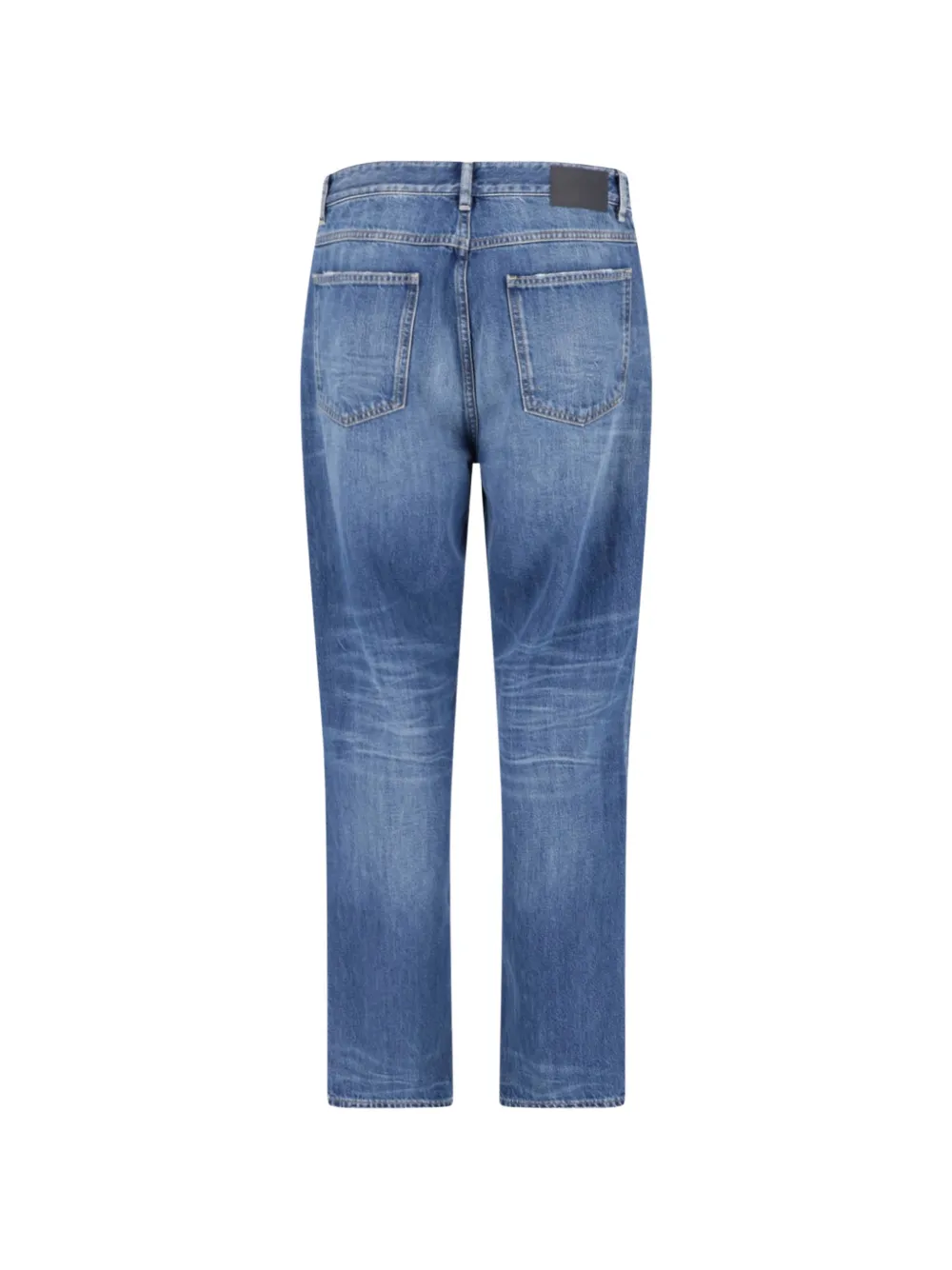 blue washed denim whiskering effect at the thighs belt loops classic five pockets logo patch to the rear front button and zip fastening straight leg