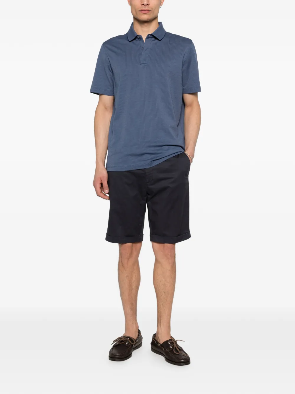 navy blue cuffed hem button fastening belt loops side seam pockets back welt pockets