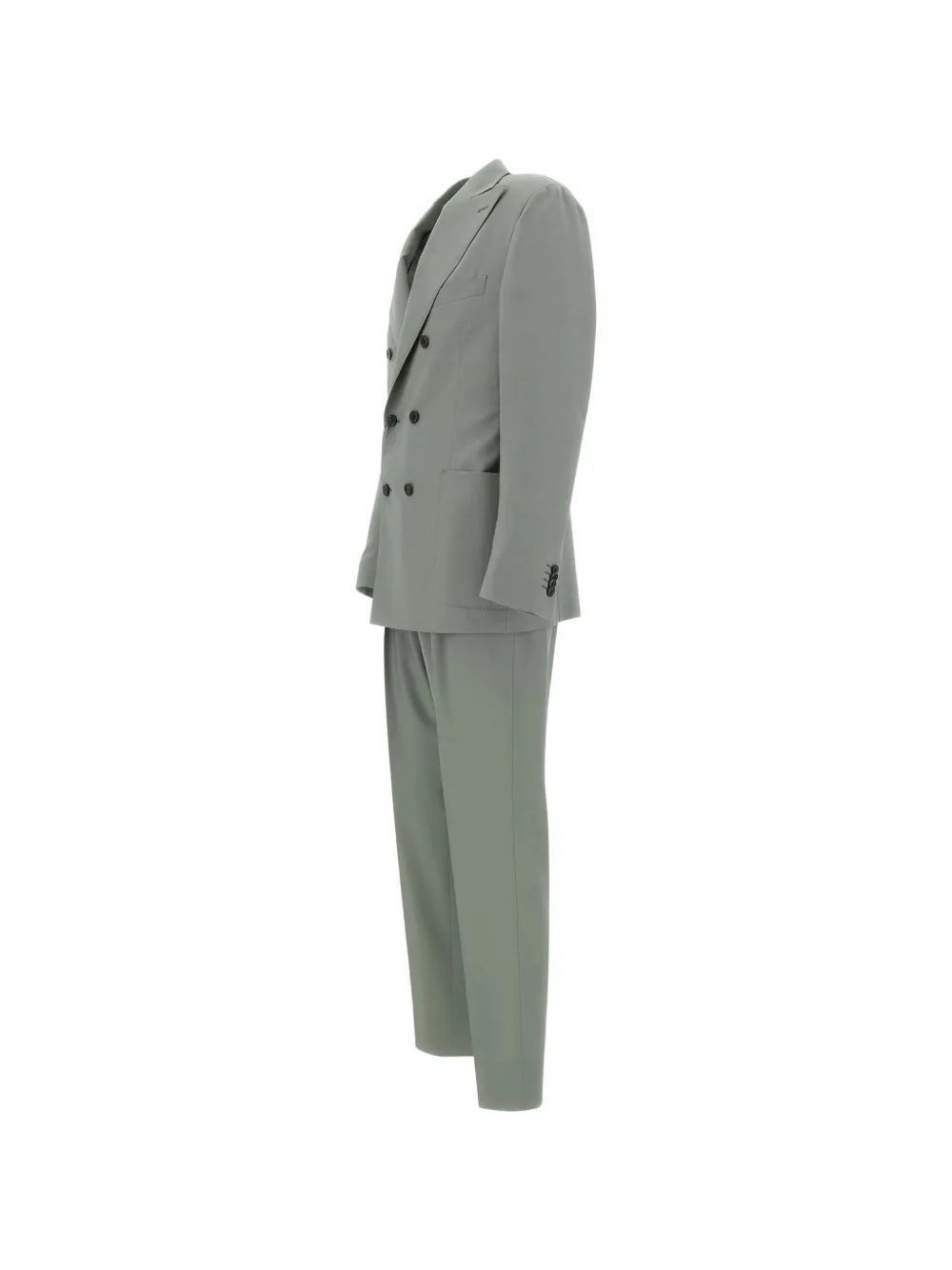 sage green virgin wool six-button jacket peak lapels double pleats natural horn button