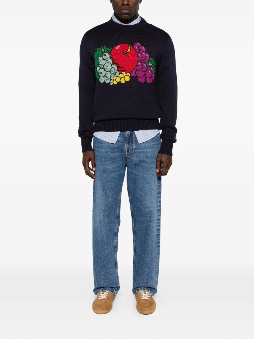 blue and multicolour fruit motif round neck ribbed hem ribbed cuffs