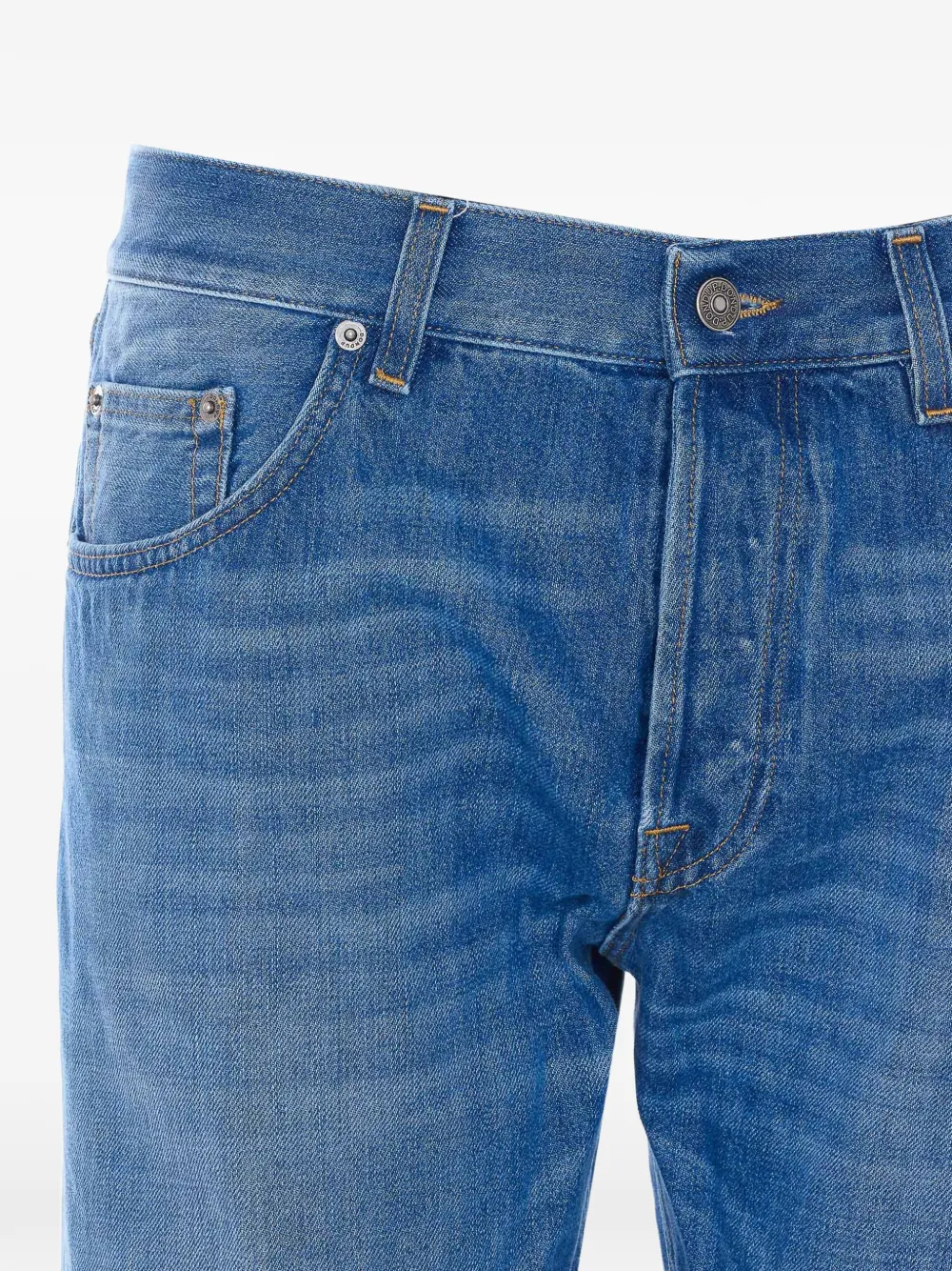 blue whiskering effect button fastening five pockets logo patch to the rear turned-up hems