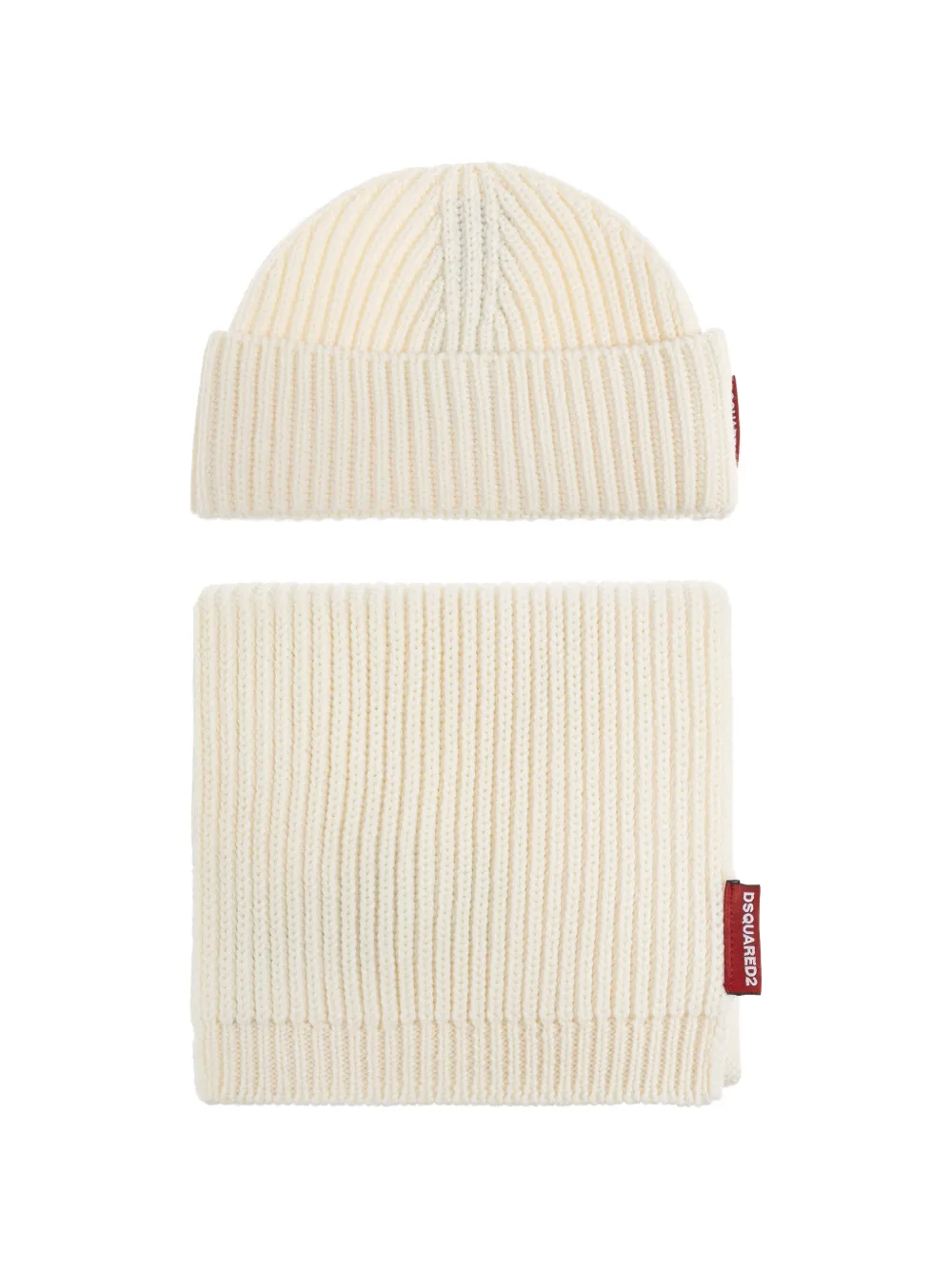 beige ribbed knit includes a hat includes a scarf logo patch scarf included