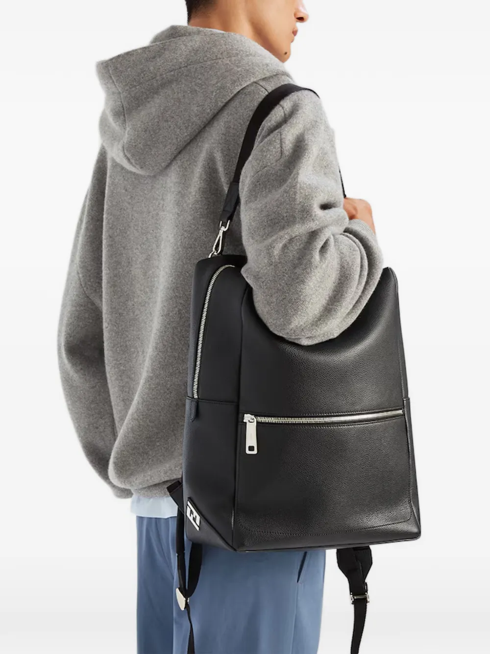 black leather pebbled texture silver-tone logo plaque two-way zip fastening front zip-fastening pocket single top handle adjustable shoulder straps silver-tone hardware
