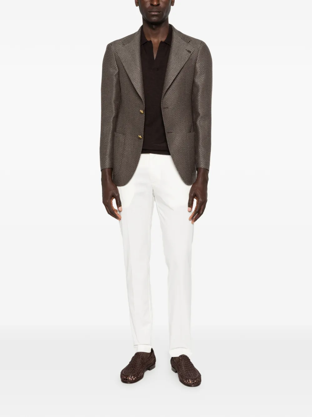 brown herringbone pattern button fastening notched lapels welt pocket long sleeves