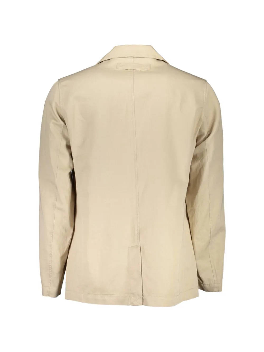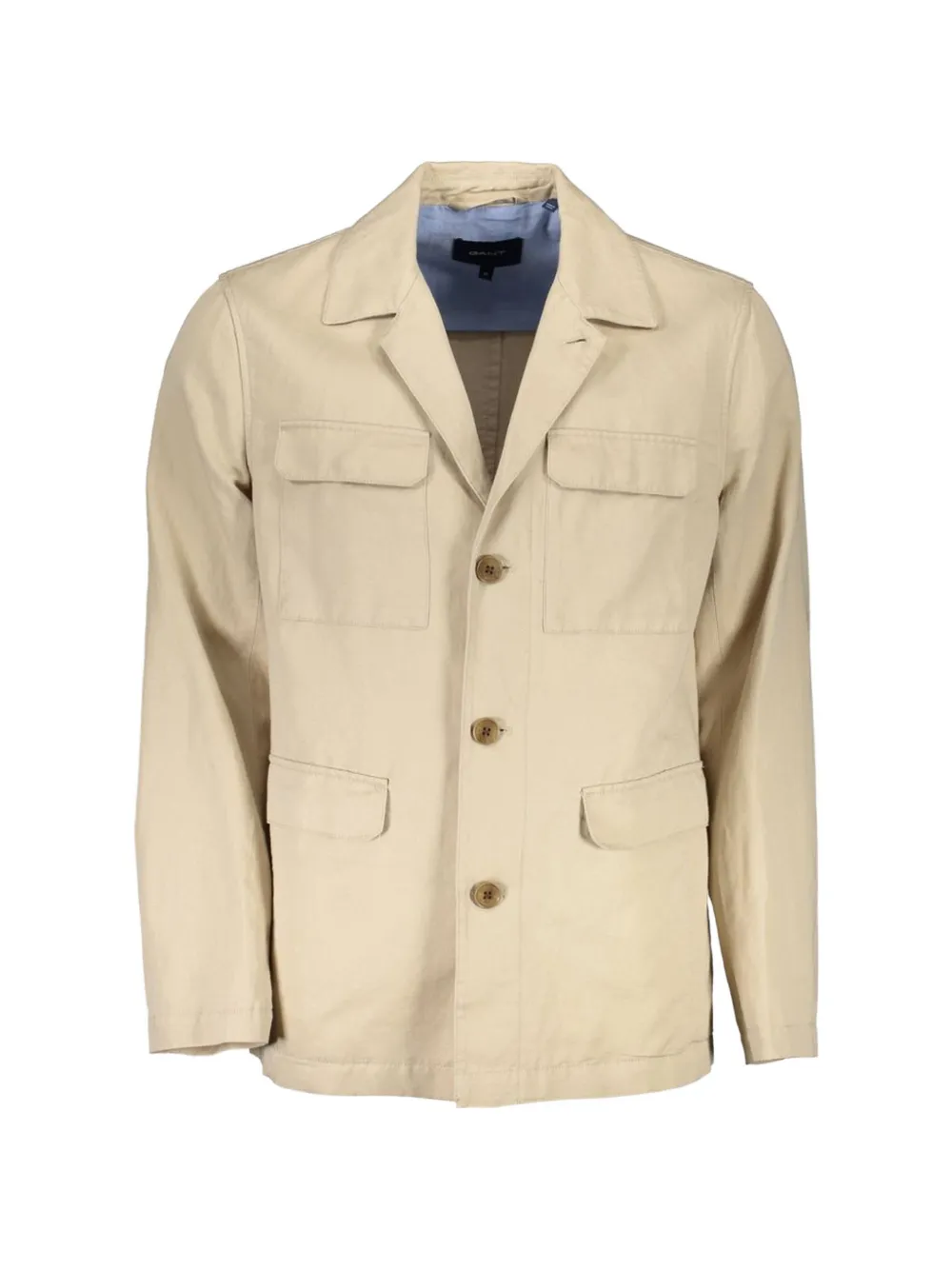 beige cotton notched lapels front button fastening long sleeves two chest flap pockets two front flap pockets rear central vent