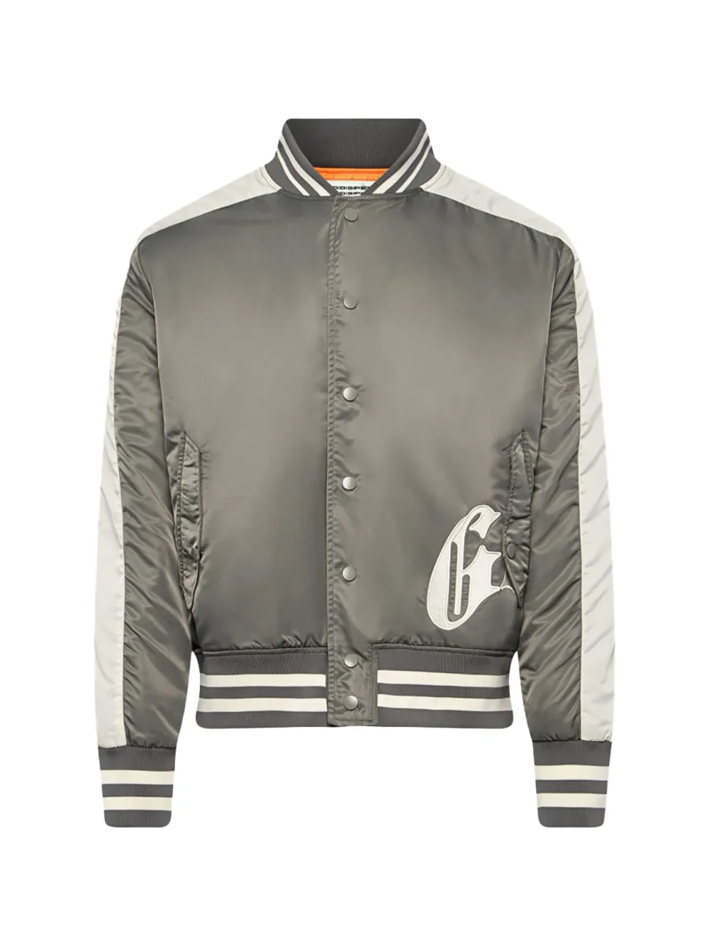grey logo button fastening striped trim long sleeves ribbed hem