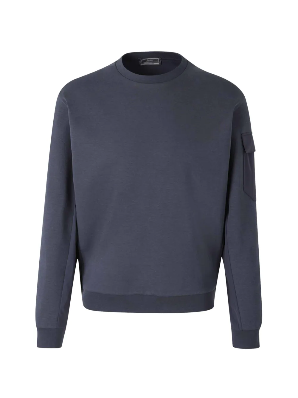 dark blue crew neck patch pocket ribbed cuffs ribbed hem long sleeves