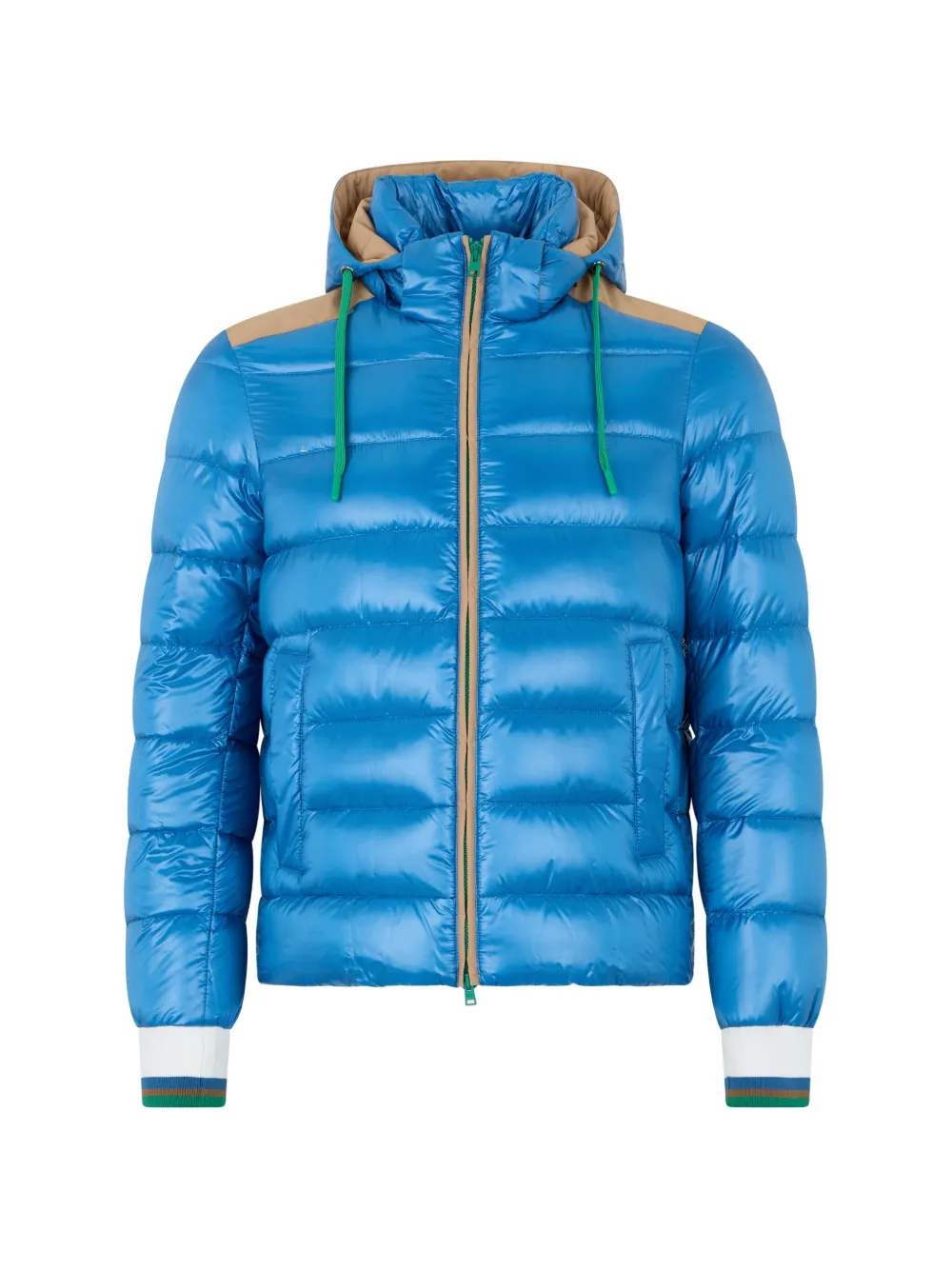 vibrant blue zip closure hood horizontal stripes contrasting detail sleeves